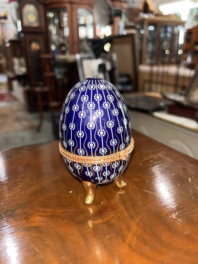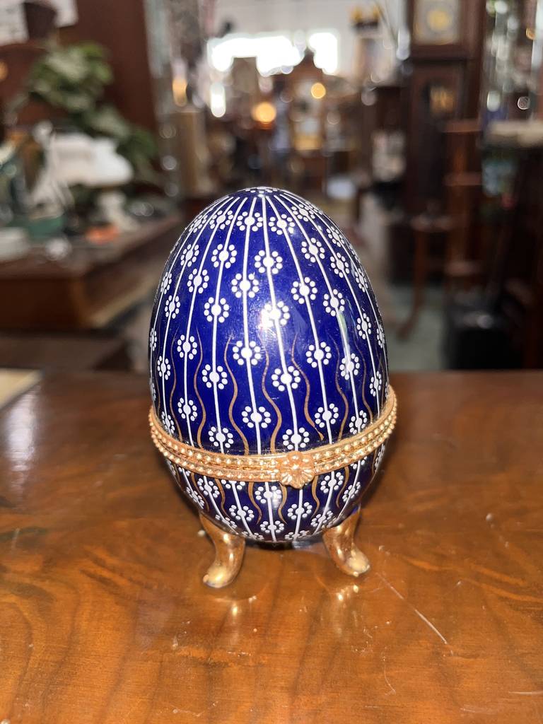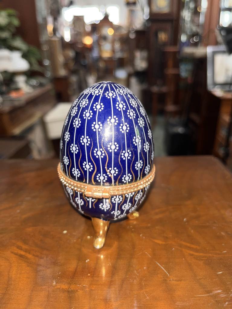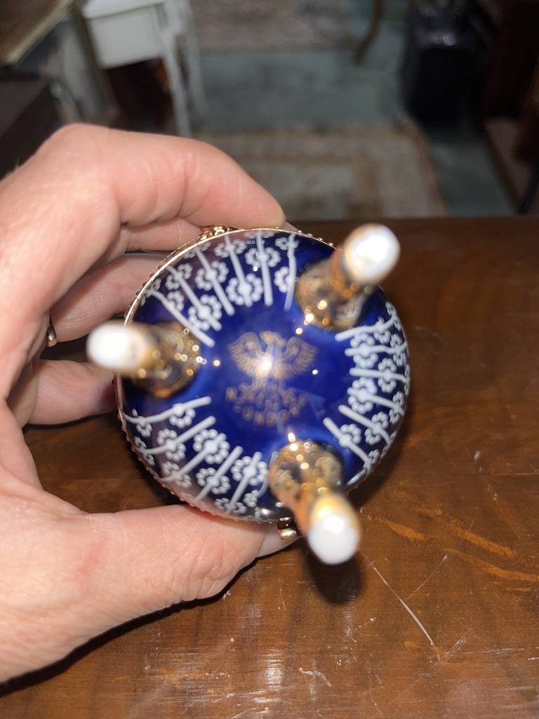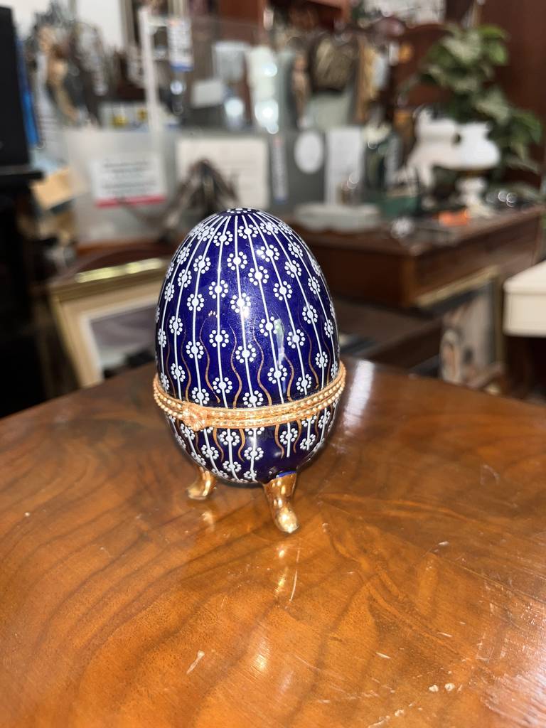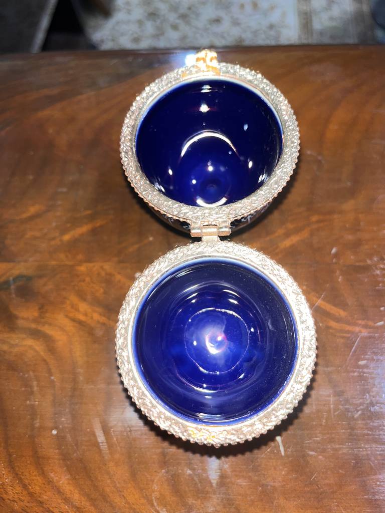 Joyero neundorf con forma de huevo de color azul marino con pequeños dibujos de flores de color blanco. Se trata de un pequeño joyero con forma de huevo que tiene tres pequeñas patas que lo sujetan de pie y se abre por la mitad dejando ver un espacio reducido para guardar pendientes o anillos. Como se puede observar en las fotografías se encuentra en buen estado.