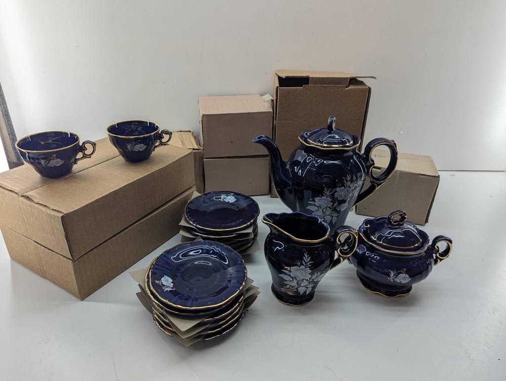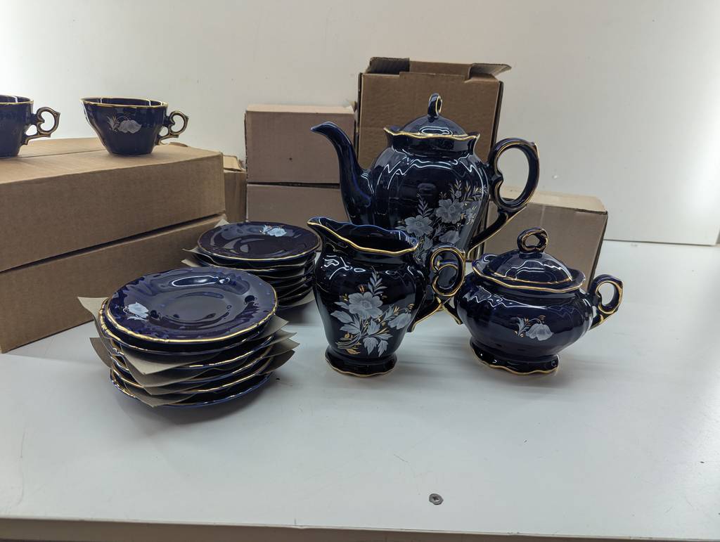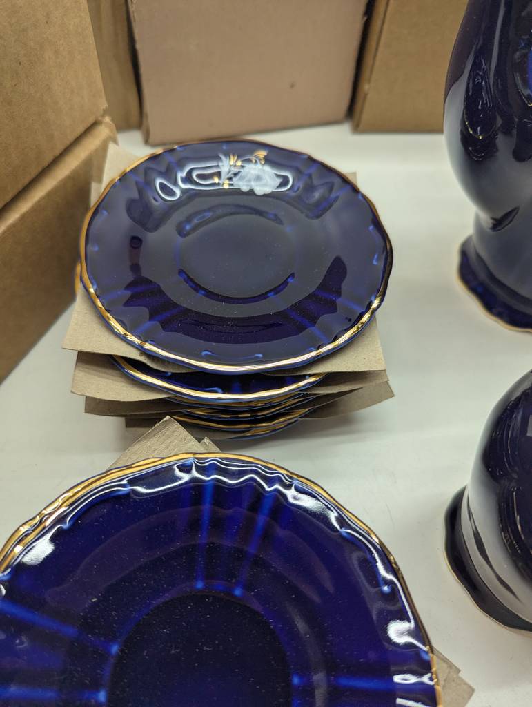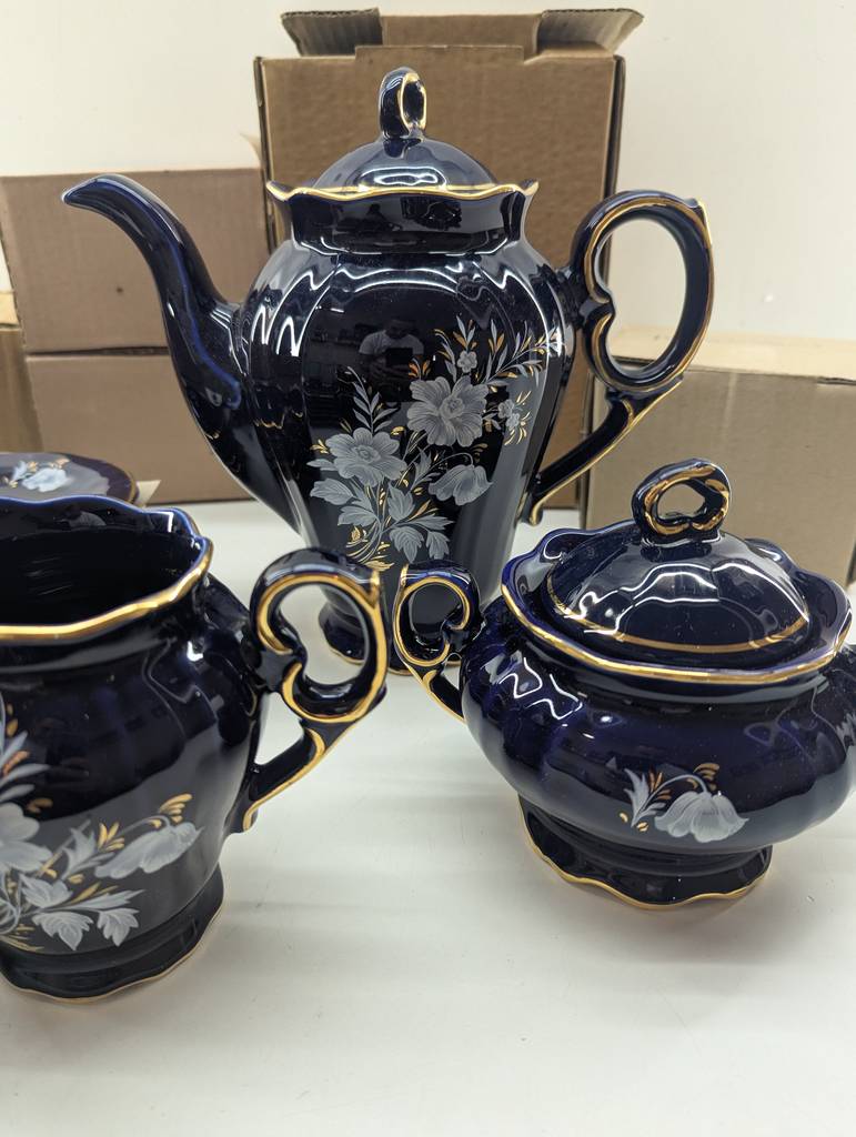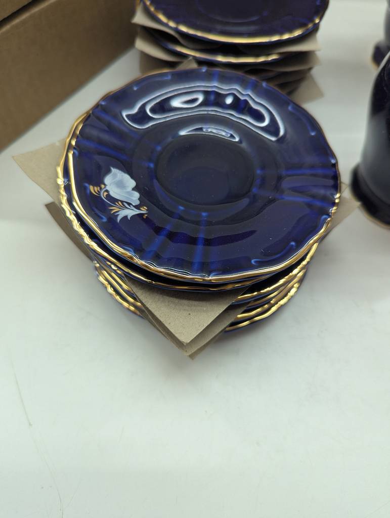 Juego de café muy bonito y elegante en color azul oscuro y con los bordes dorados y brillantes. Se trata de un juego de café compuesto por 12 servicios con sus tazas y platos, así como una azucarera, una jarra grande con tapa y otra de tamaño medio con abertura grande. Es ideal para la hora del café o té con gran cantidad de invitados. Se encuentra nueva a estrenar y en buenas condiciones.