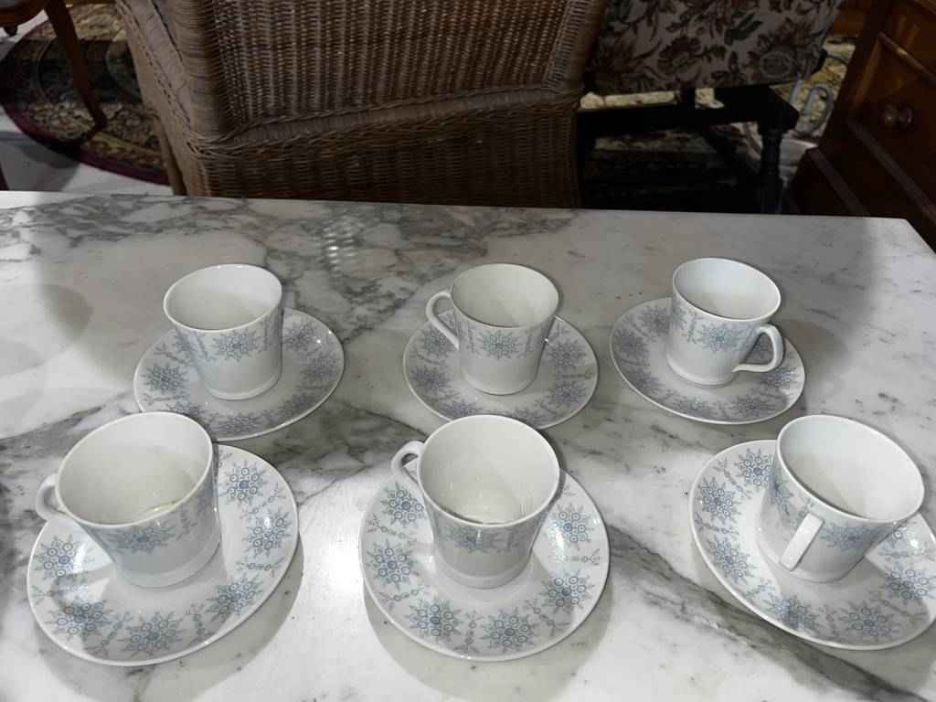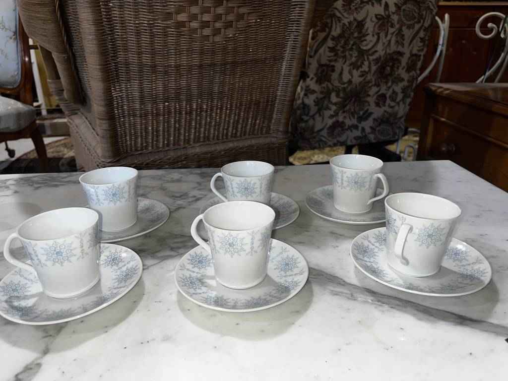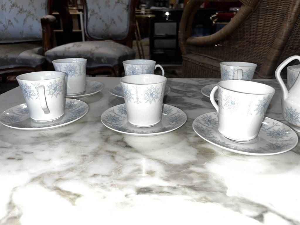 Juego de café de la marca San Claudio que se compone de 12 tazas con platitos, una jarra para servir café o té, una más pequeña para servir leche y una azucarera con tapa incluida. Tienen dibujos y detalles muy bonitos y originales. Es ideal para recibir gran cantidad de invitados a la hora del té en nuestro hogar. Como podemos observar en las fotografías se encuentra en buenas condiciones.