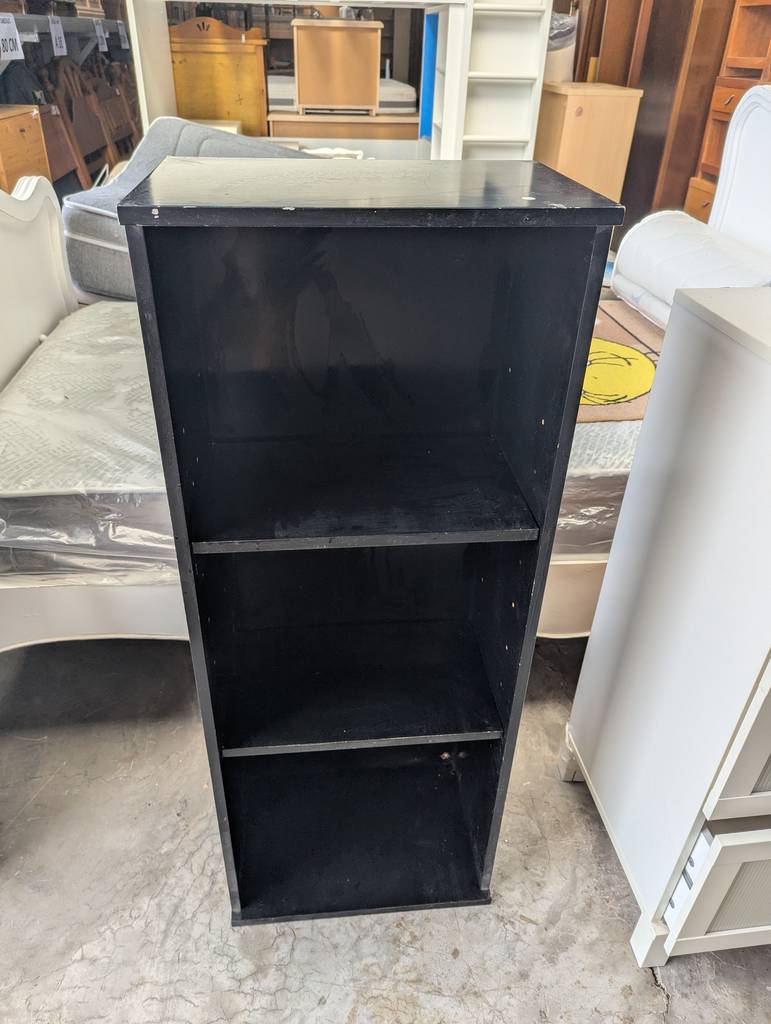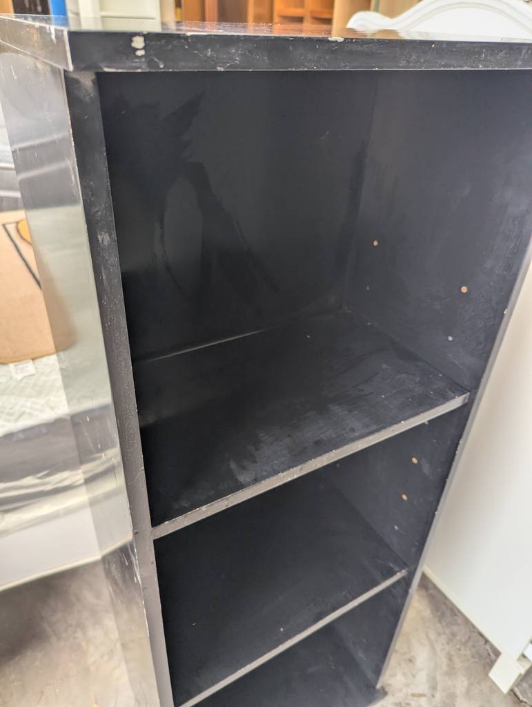 Librería o estantería modelo Billy de la reconocida marca de muebles Ikea en color negro y con un efecto en roble que la hace resaltar. Se compone de tres habitáculos abiertos altos y grandes, ideales para colocar una colección de libros, cómics o también exponer figuras de colección. Quedaría perfecta en un salón comedor. Como podemos observar en las fotografías presenta desperfectos.
