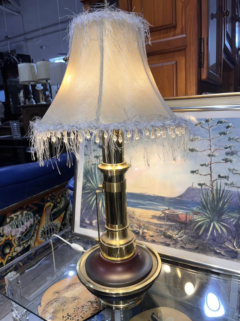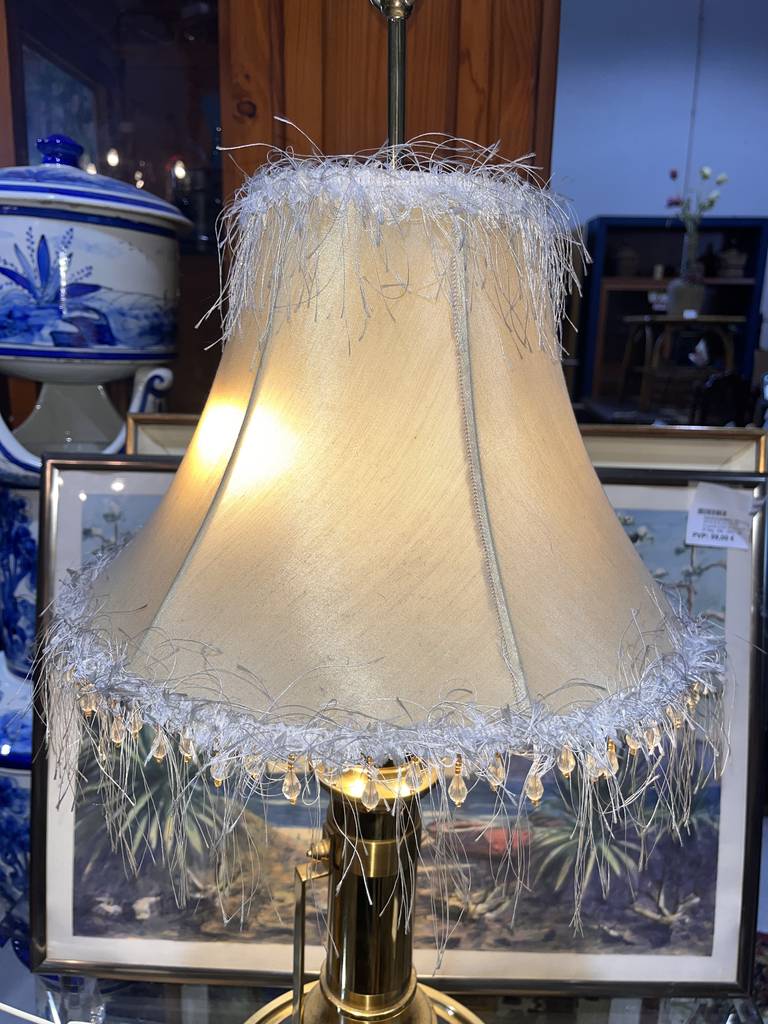 Lámpara de mesa de estilo clásico cuya estructura está fabricada en metal de color marrón oscuro y dorado y tiene una tulipa con adornos de perlas colgantes e hilos. Se trata de una elegante lámpara de mesa clásica que resulta perfecta para colocarla encima de una cómoda en un salón comedor. Como se puede observar en las fotografías se encuentra en buenas condiciones.