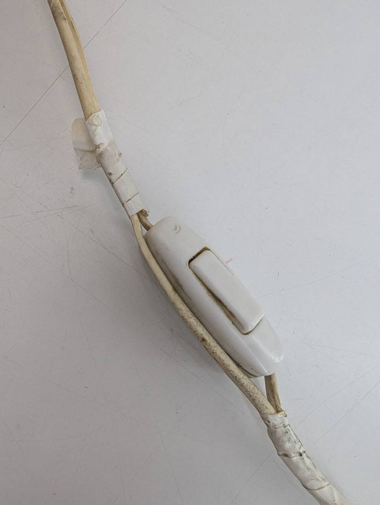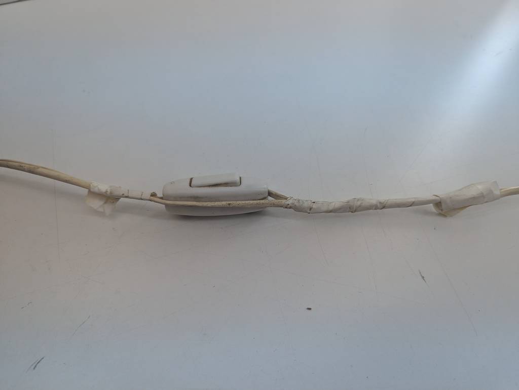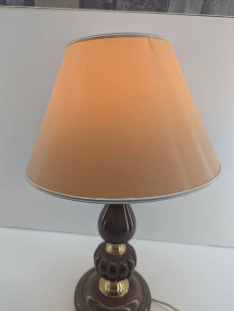 Lámpara de mesa de estilo clásico con un pie robusto de madera en marrón oscuro y con detalles dorados que la hacen resaltar. En la parte superior tiene un punto de luz rodeado por una gran tulipa. Dispone de interruptor de encendido y apagado en el cable. Como podemos observar en las fotografías presenta desperfectos en el cable pero en general se encuentra en buenas condiciones.