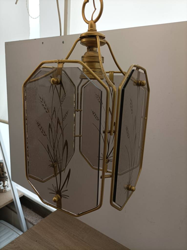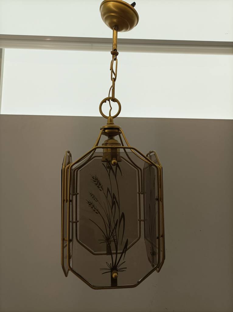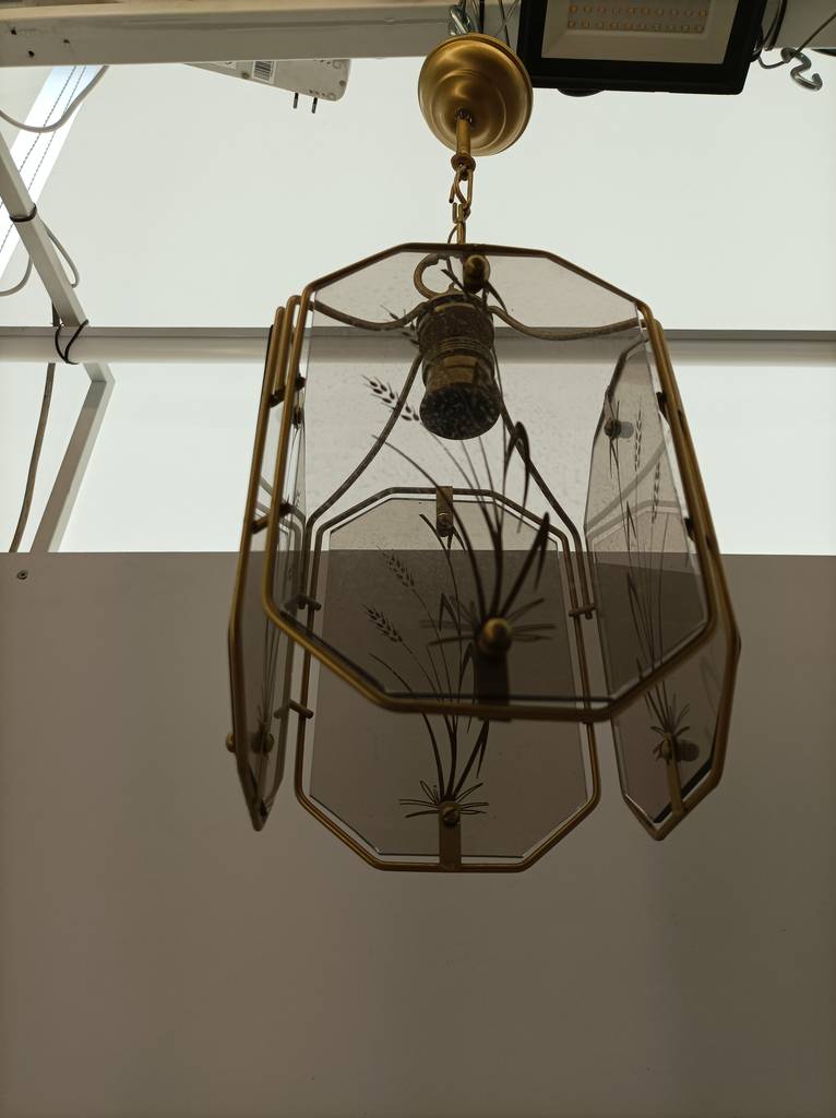 Lámpara de techo de estilo vintage con una forma alargada y rectangular. Se trata de una lámpara colgante en tonos dorados que tiene un soporte en forma de eslabones de cadena y dispone de cuatro pantallas de cristal que rodean la única bombilla que tiene. Es una lámpara ideal para colgarla del techo de un salón comedor o de un dormitorio. Como se puede observar en las fotografías se encuentra en buenas condiciones.