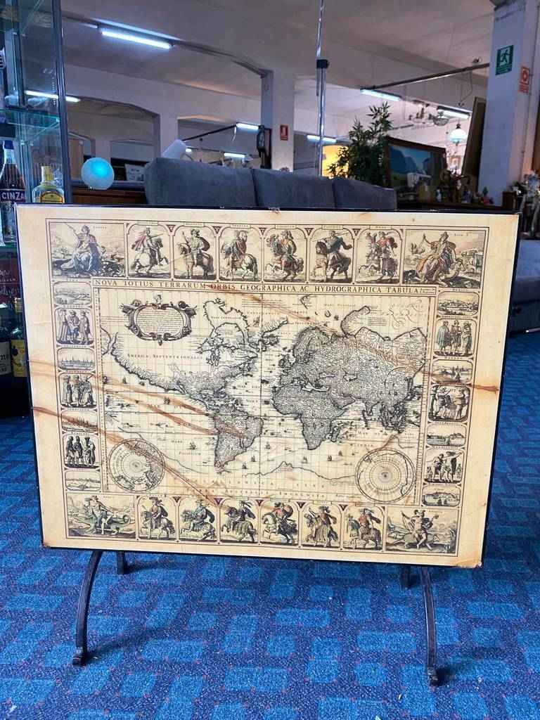 Cuadro del mapa del mundo en el año 1668 del famoso editor, impresor y marchante de estampas neerlandés Frederik de Wit. En él podemos observar el mundo y alrededor de este múltiples personalidades a caballo entre otros menesteres. Es una pieza única ideal para coleccionistas o amantes de la historia. Como podemos observar en las fotografías presenta desgaste del tiempo.
