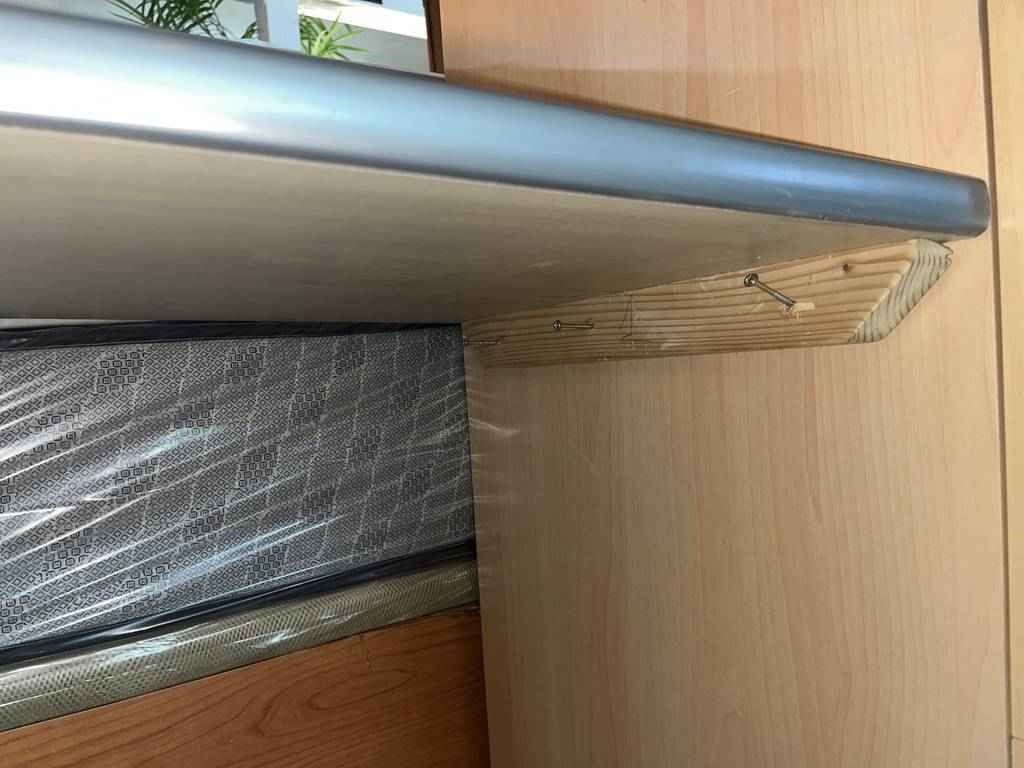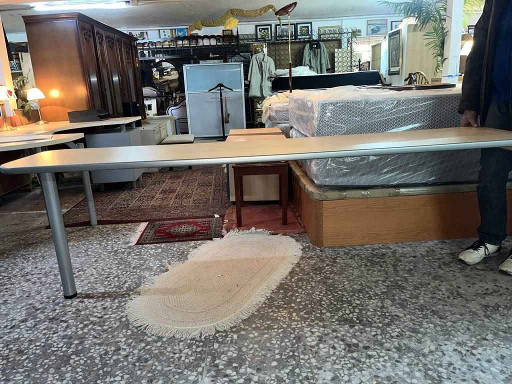 Mesa alargada y estrecha con una pata en uno de los laterales. El otro lateral está preparado para anclar a una madera o también a la pared, por ejemplo. Se trata de una mesa auxiliar, la cual se puede utilizar como escritorio o también como mesa en una cocina. Se puede utilizar también como mesa para colocar documentos en la oficina. La parte superior la tiene hecha de madera color marrón clarita, y se encuentra bien cuidada como se puede ver en las fotografías.