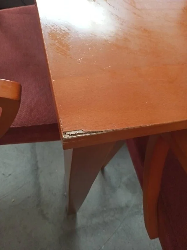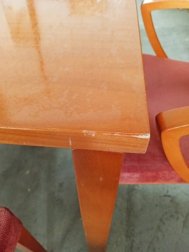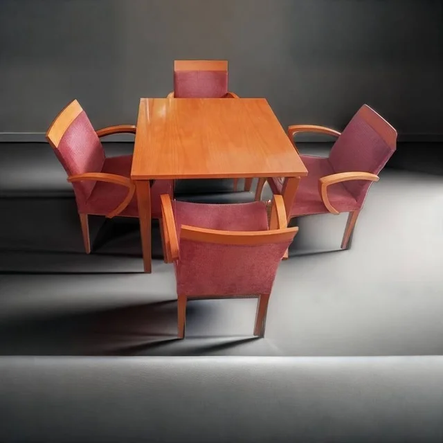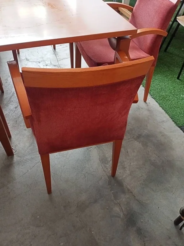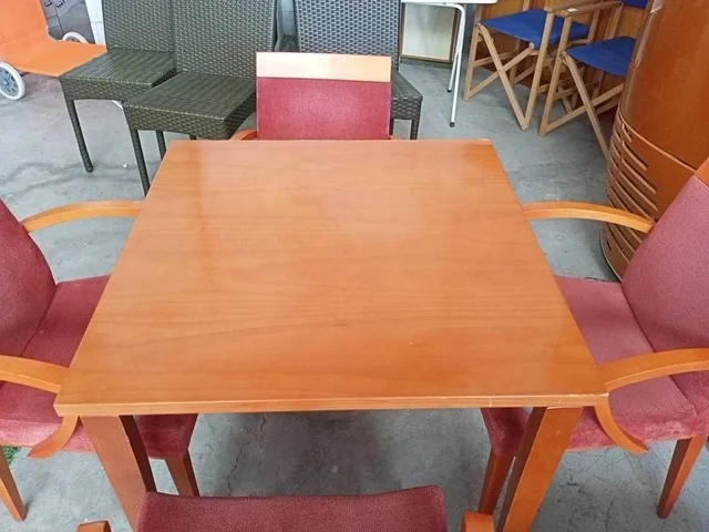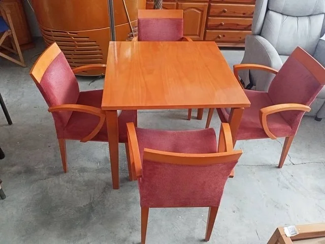 Conjunto compuesto por una esa de cafetería y cuatro sillas a juego con ella. Están hechas de madera de buena calidad y robusta color marrón, y disponen de patas resistentes que les dan una muy buena estabilidad. Las sillas tienen la parte del asiento y del respaldo acolchada y, además, disponen de reposabrazos en los laterales que las hacen muy cómodas. Tienen algunos pequeños desperfectos en la madera que se pueden ver en las fotografías.