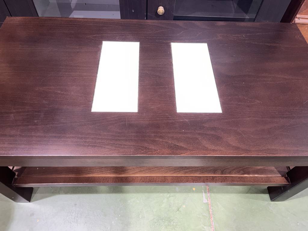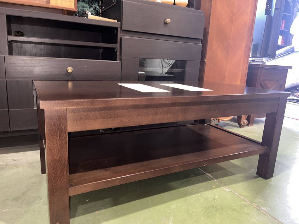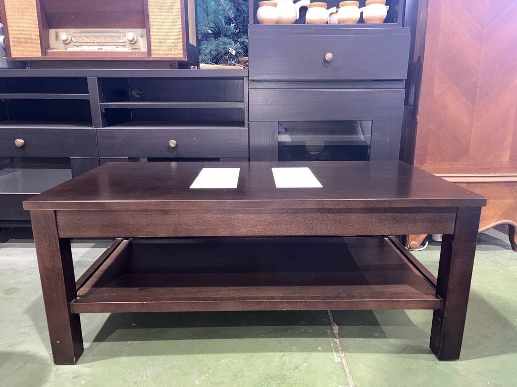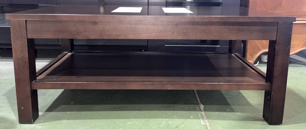 Mesa de centro fabricada en madera de buena calidad de color marrón oscuro. Se trata de una mesa de centro baja que tiene dos superficies rectangulares y alargadas y cuenta con cuatro patas robustas. Es una mesa ideal para colocarla en el centro de un salón comedor amplio y moderno. Como se puede observar en las fotografías se encuentra en buenas condiciones.