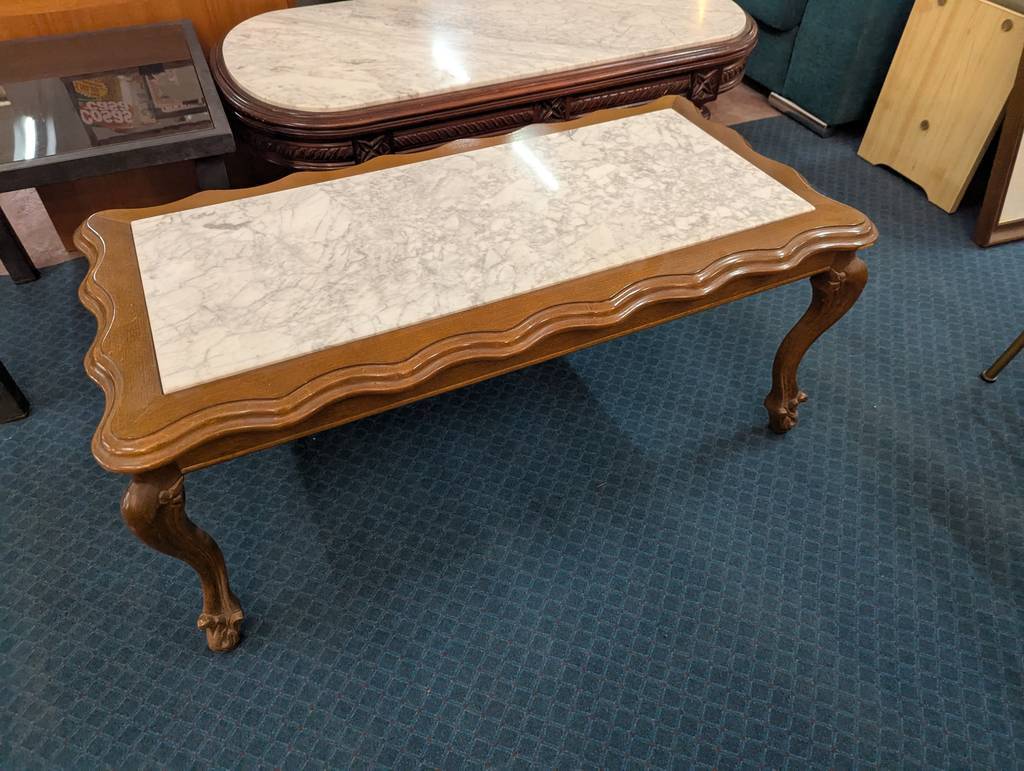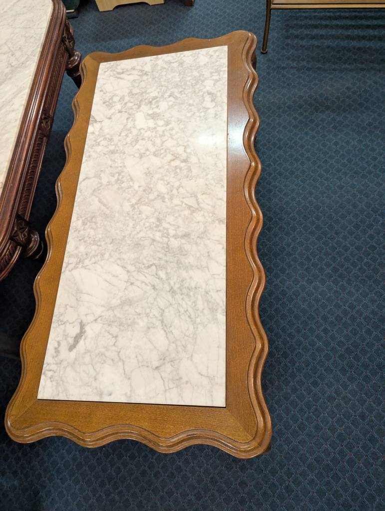 Mesa de centro fabricada en mármol y madera de buena calidad de color marrón claro. Se trata de una mesa de centro que tiene una forma rectangular y alargada y está formada por cuatro patas robustas y una superficie con los bordes redondeados. Es una mesa ideal para colocarla en el centro de un salón comedor entre un sofá y una televisión. Como se puede observar en las fotografías se encuentra en buenas condiciones.