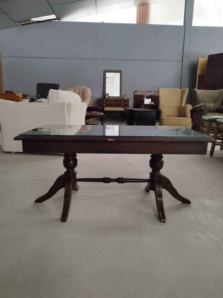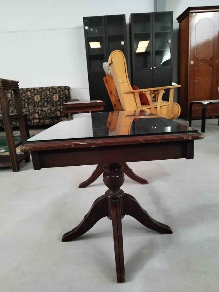 Mesa cuadrada de estilo clásico que ha sido realizada con madera de buena calidad y robusta. Dispone en la parte superior de un cristal grueso transparente que protege la madera, lo que le aporta durabilidad. Tiene dos patas unidas por un fino listón de madera que la convierte en una mesa muy estable. Es ideal para colocar en un salón comedor. Como podemos observar en las fotografías presenta algunos desperfectos.