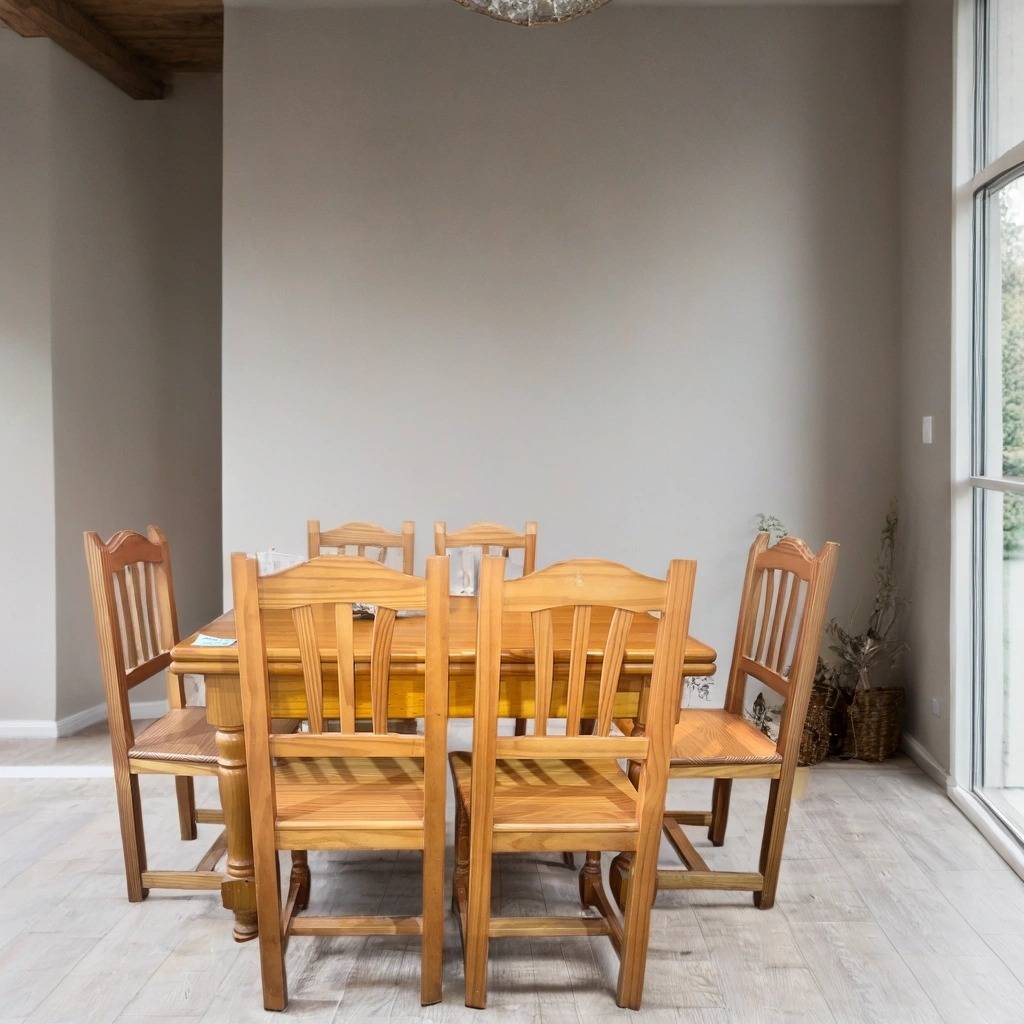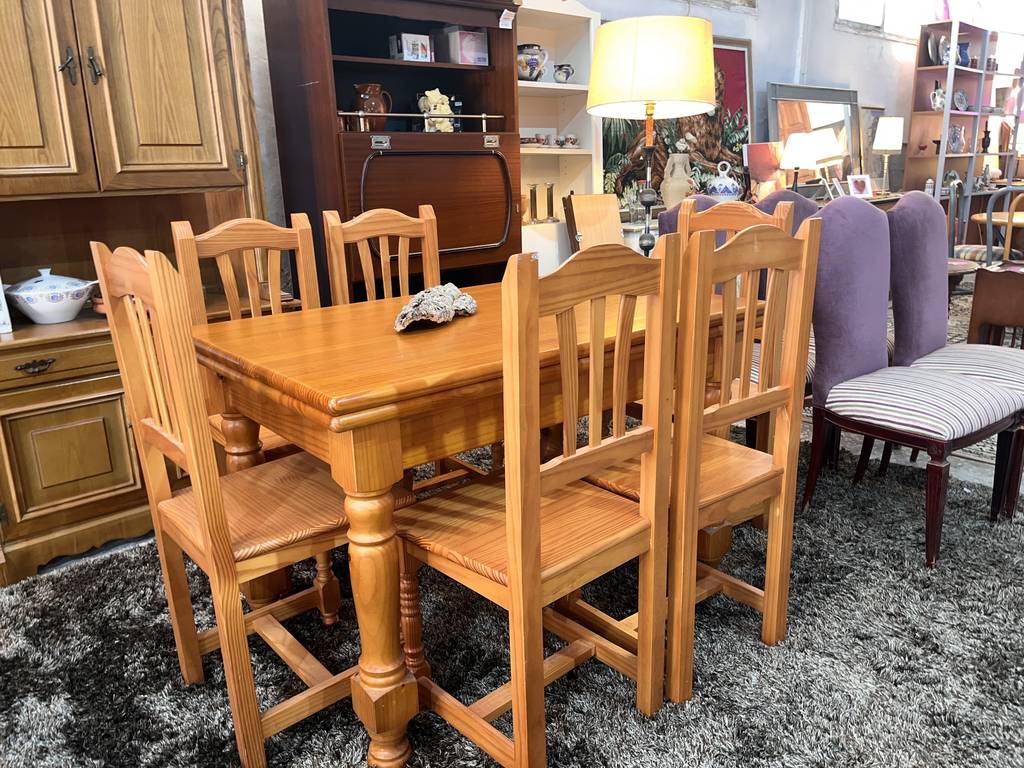 Mesa extensible y seis sillas todo ello fabricado en madera de buena calidad de color marrón claro. Se trata de una mesa con una forma rectangular que aumenta de tamaño, ya que es extensible y va acompañada de seis cómodas sillas. Es un conjunto perfecto para colocarlo en un salón comedor. Como se puede observar en las fotografías se encuentra en buenas condiciones.
