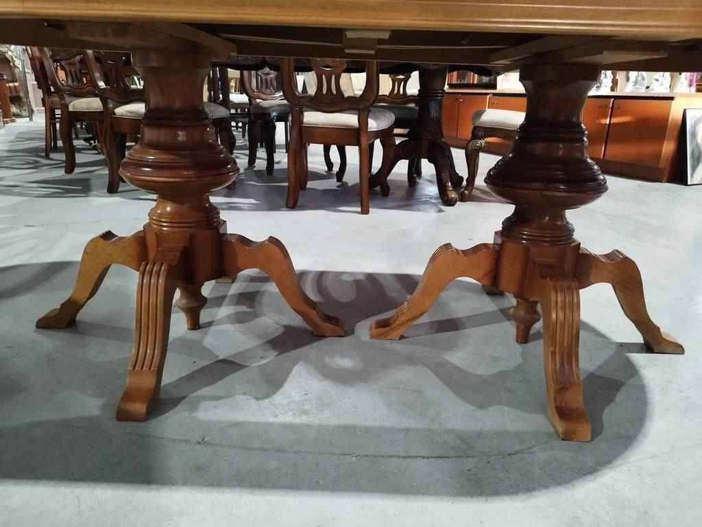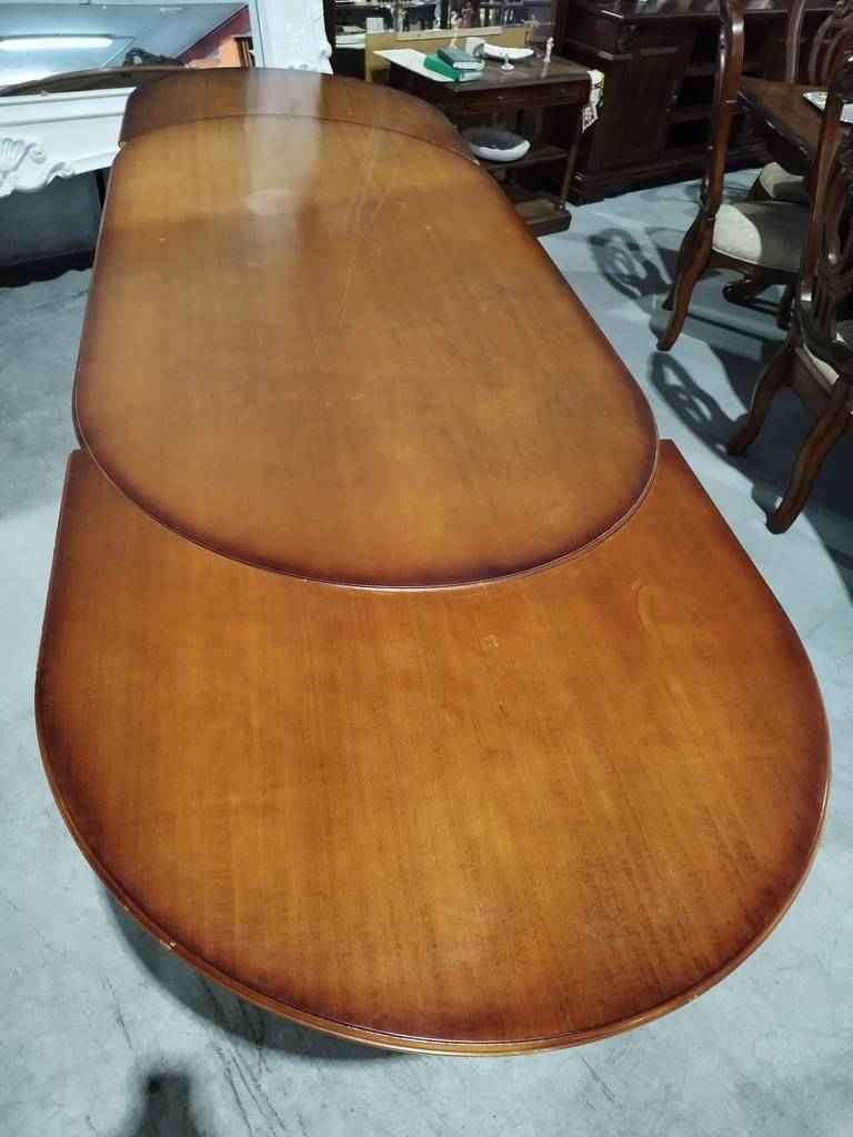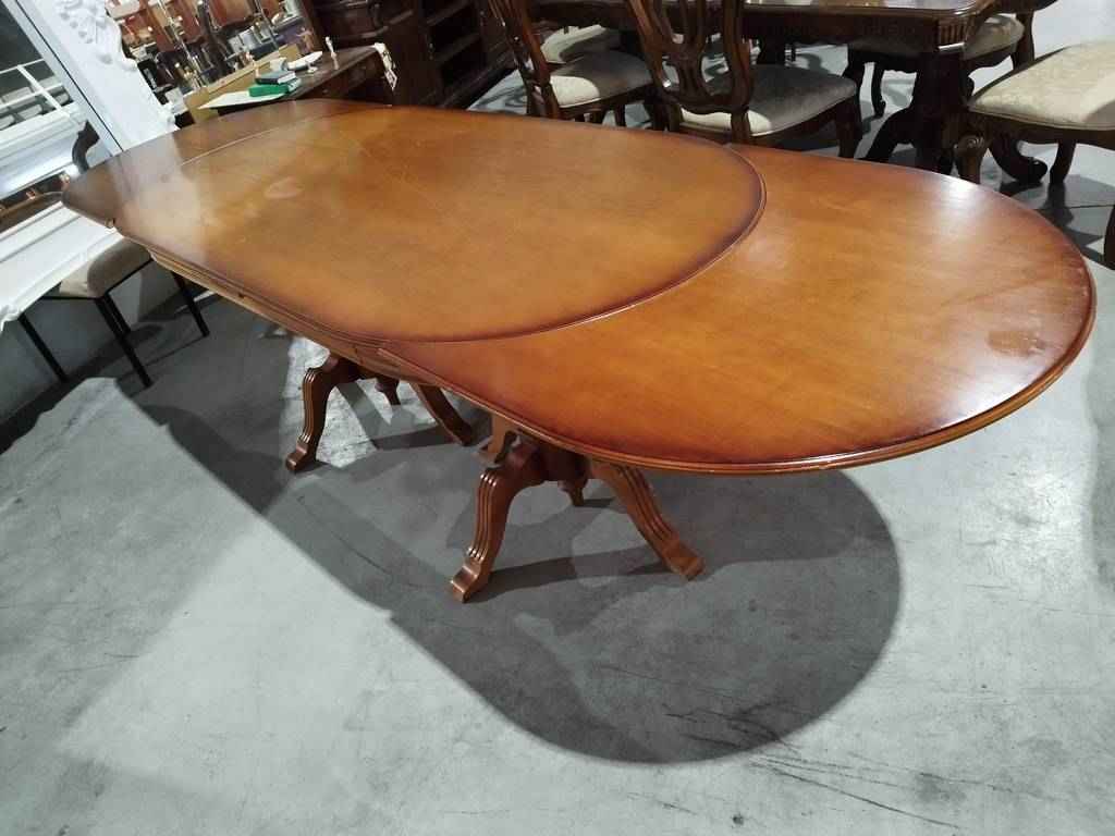 Mesa de comedor de estilo rústico. Una mesa extensible fabricada en madera de buena calidad y robusta. Su extensibilidad la hacen una mesa ideal para colocar en un salón comedor y recibir invitados. Como podemos observar en las fotografías tiene un pequeño golpe en uno de los tablones extensibles.