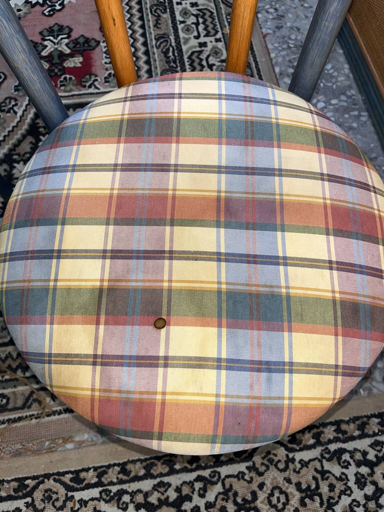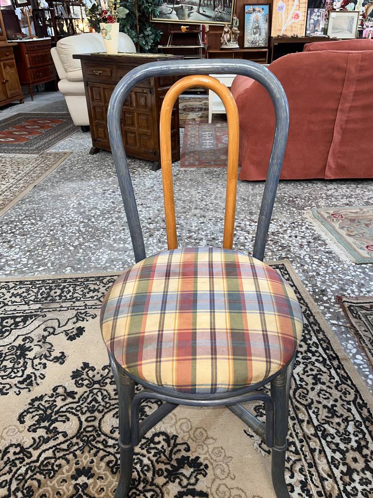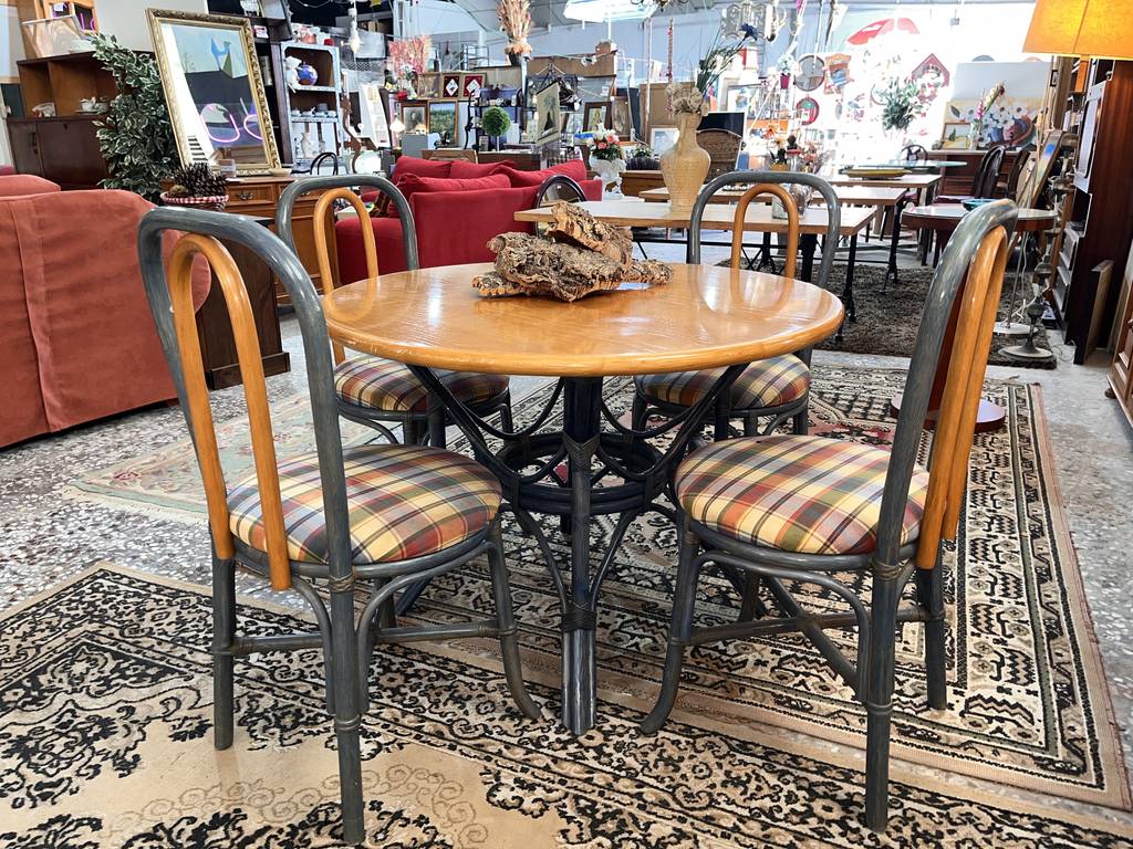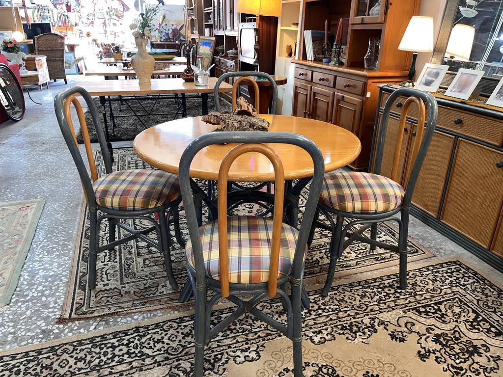 Conjunto formado por una mesa redonda y cuatro sillas, todo ello fabricado en madera de buena calidad de color marrón claro y gris. Se trata de una mesa redonda con una superficie gruesa que va acompañada de cuatro sillas con los asientos redondos y cuatro patas resistentes cada una. Es un conjunto ideal para ponerlo en un salón comedor. Como se puede observar en las fotografías se encuentra en buenas condiciones.