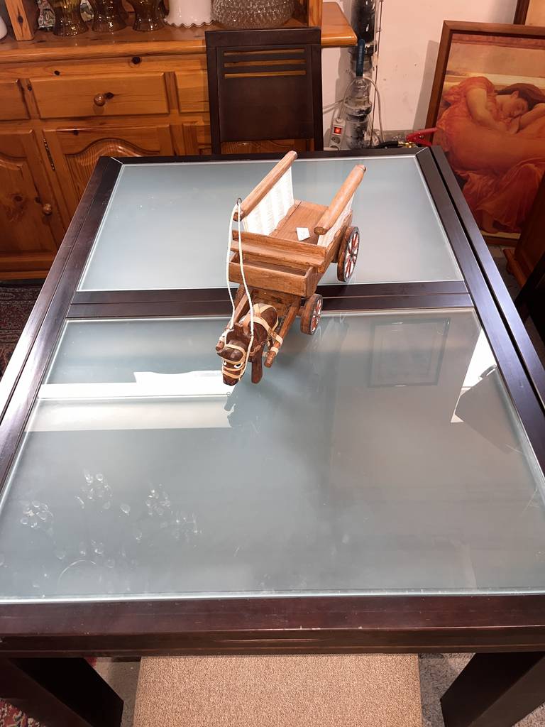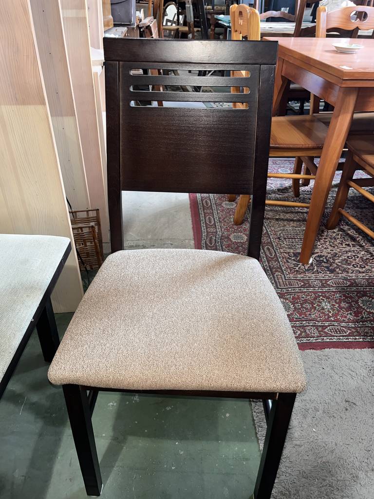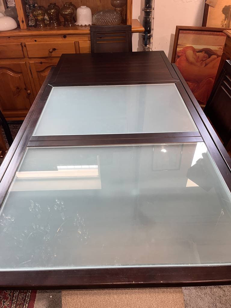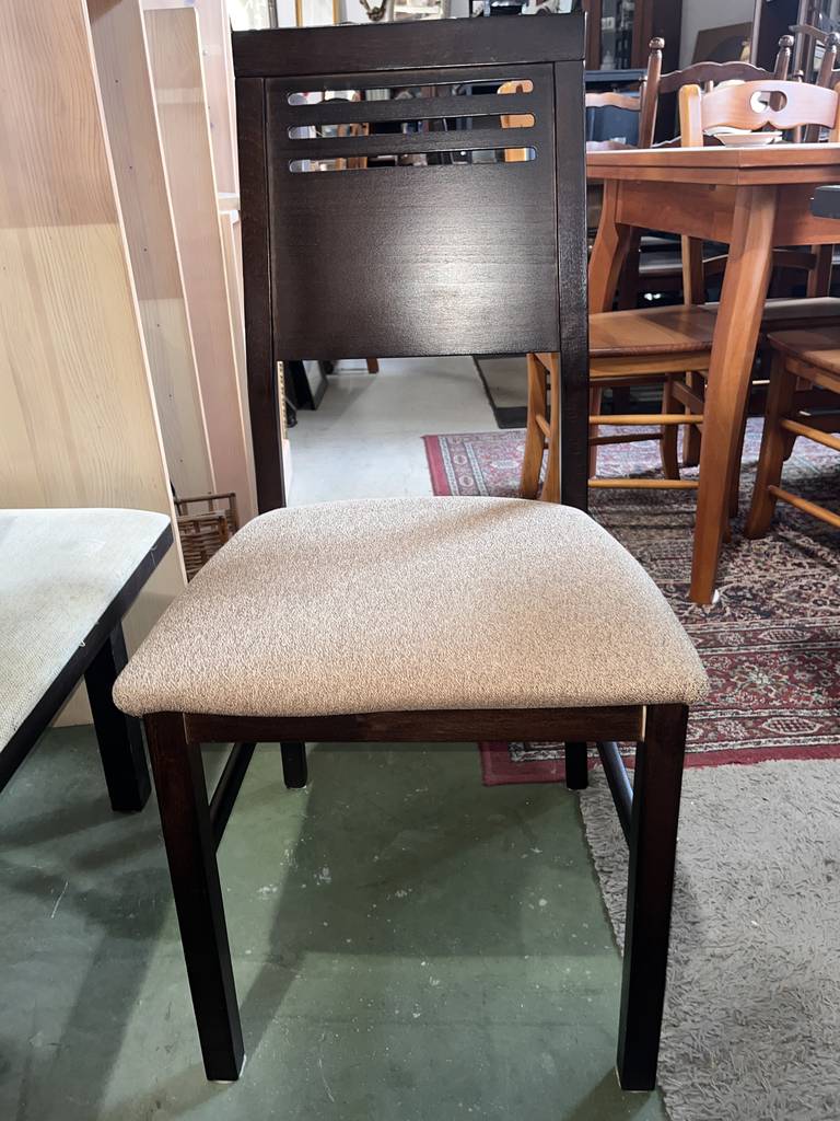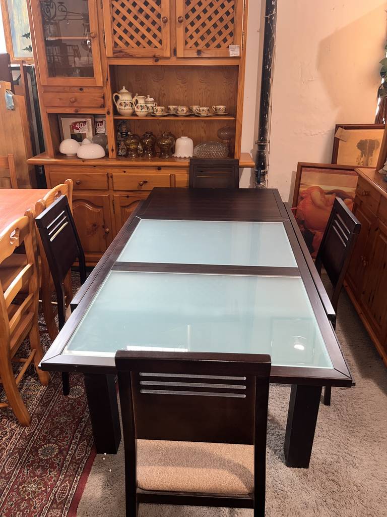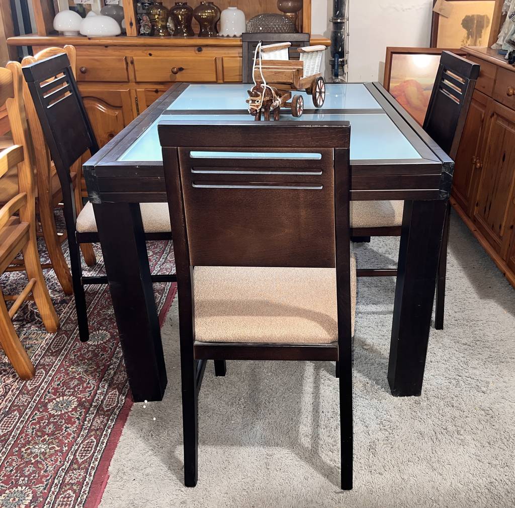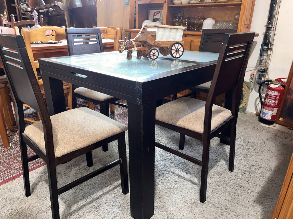 Conjunto de comedor compuesto por una mesa y cuatro sillas que han sido realizadas con madera de buena calidad y robusta en marrón oscuro. La mesa se puede extender fácilmente gracias a una balda adherida en la parte inferior lo cual la hace ideal para recibir invitados. Las sillas disponen de un asiento con un colchón mullido de tela suave. Como podemos observar en las fotografías presenta ligeros desperfectos.