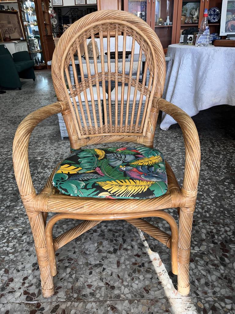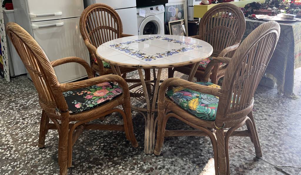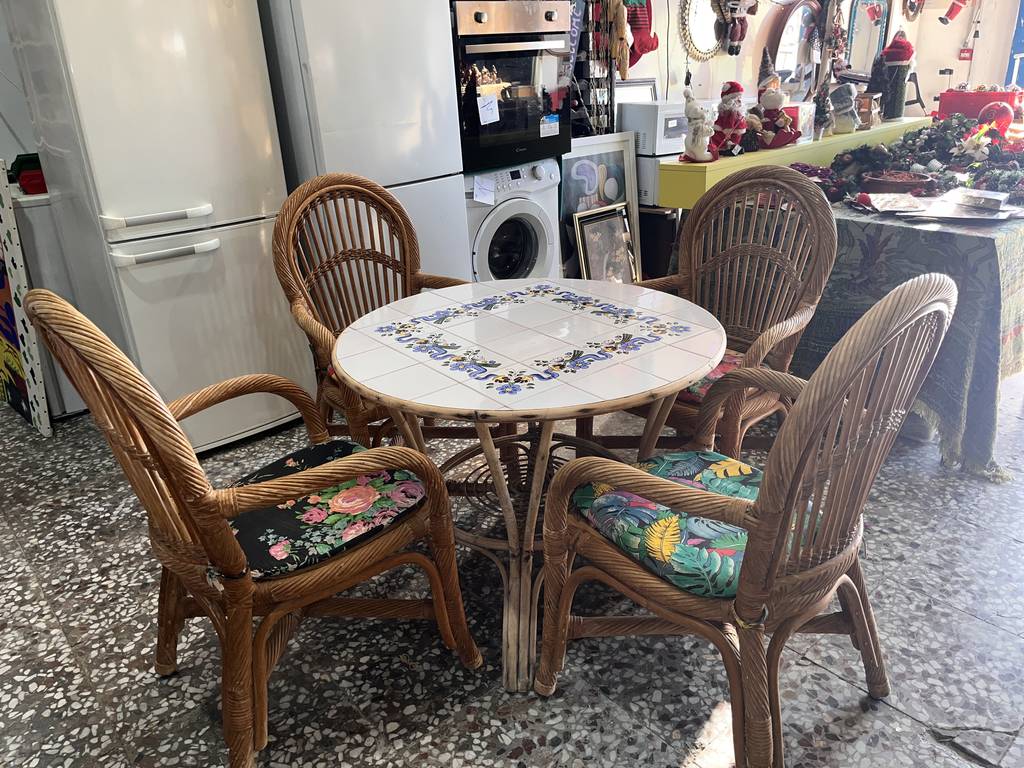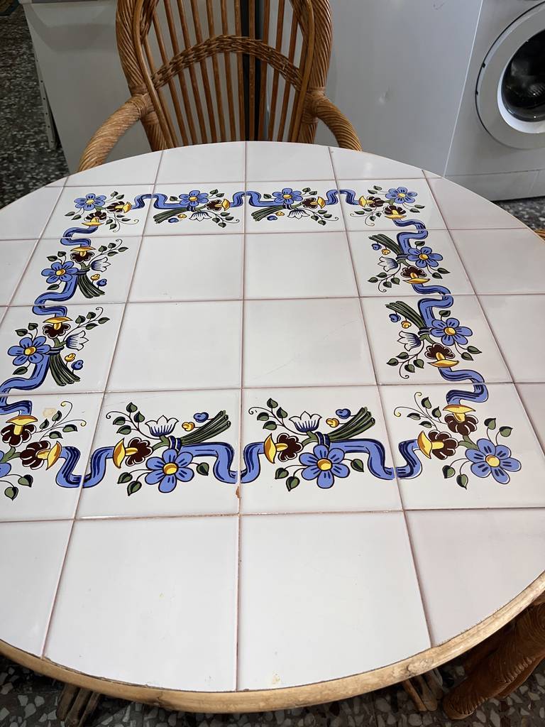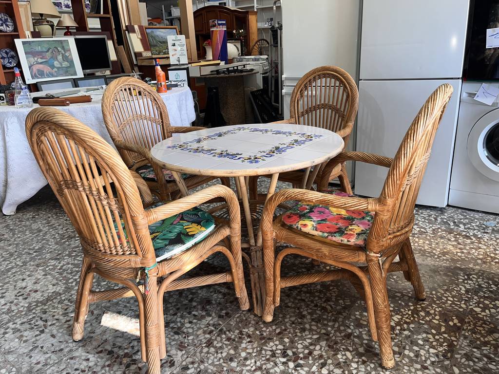Mesa y cuatro sillas de jardín cuya estructura está fabricada en madera de buena calidad de color marrón. Se trata de una mesa redonda que cuenta con una superficie realizada con azulejos blancos con dibujos y va acompañada de cuatro sillas cuyos asientos están acolchados con flores. Es un conjunto ideal para ponerlo en un jardín. Como se puede observar en las fotografías se encuentra en buenas condiciones.