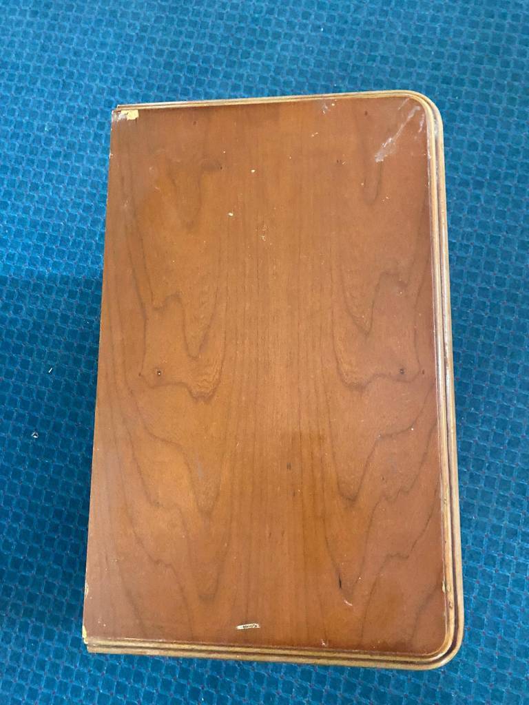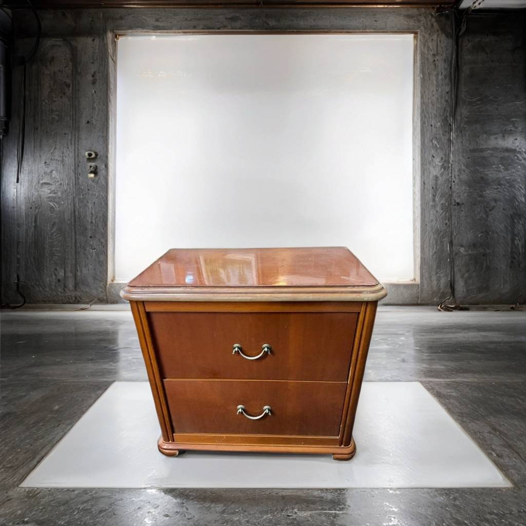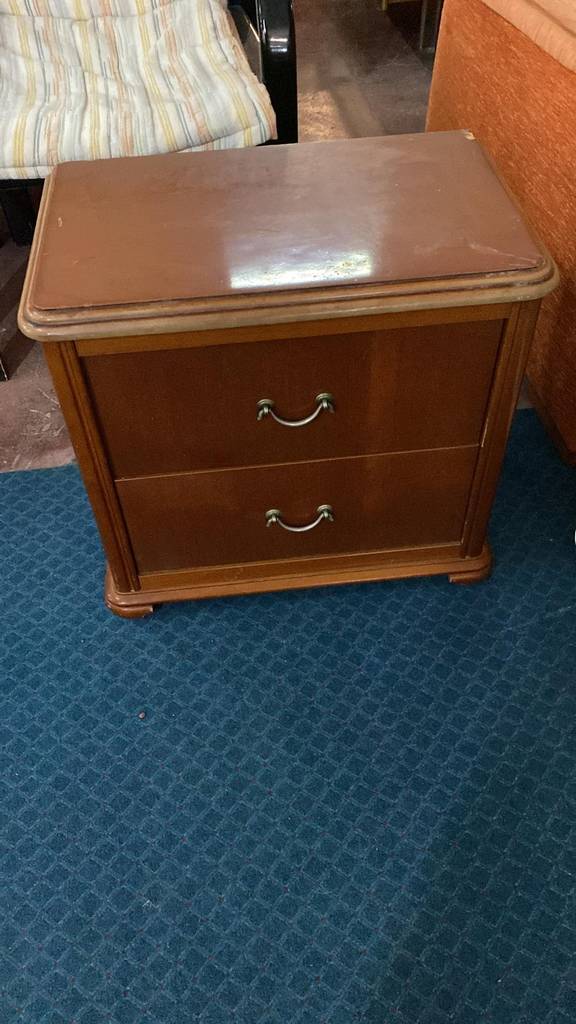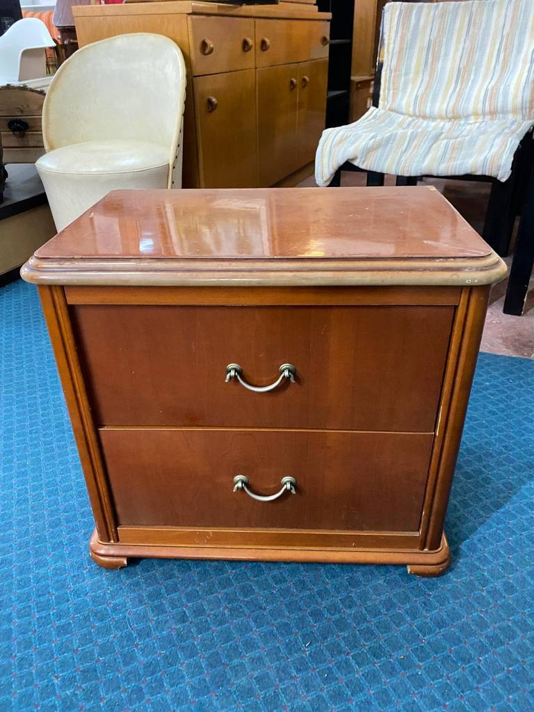 Mesita de noche fabricada en madera de buena calidad de color marrón claro. Se trata de una mesita de noche que dispone de dos cajones con un asa metálica en forma de arco cada uno. Es una mesita perfecta para colocarla al lado de una cama en un dormitorio individual. Como se puede observar en las fotografías se encuentra en buenas condiciones para ser utilizada.