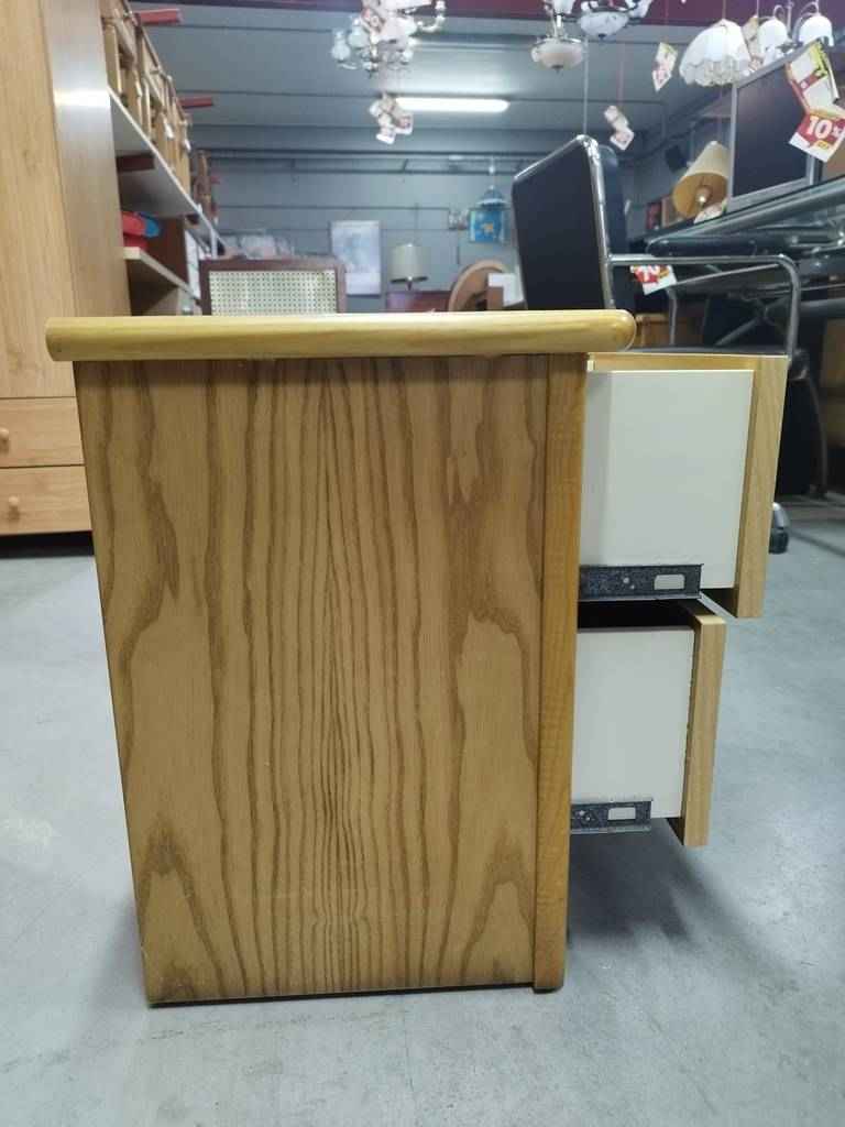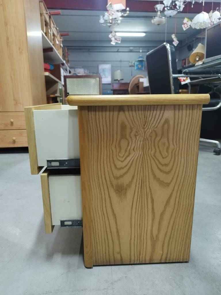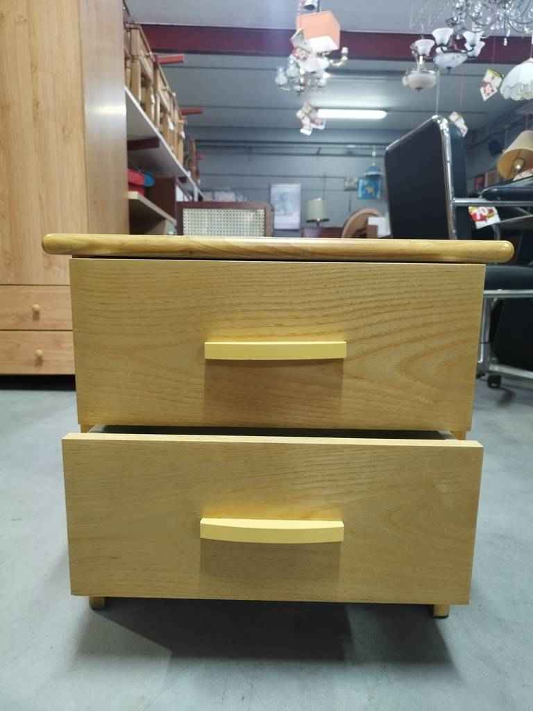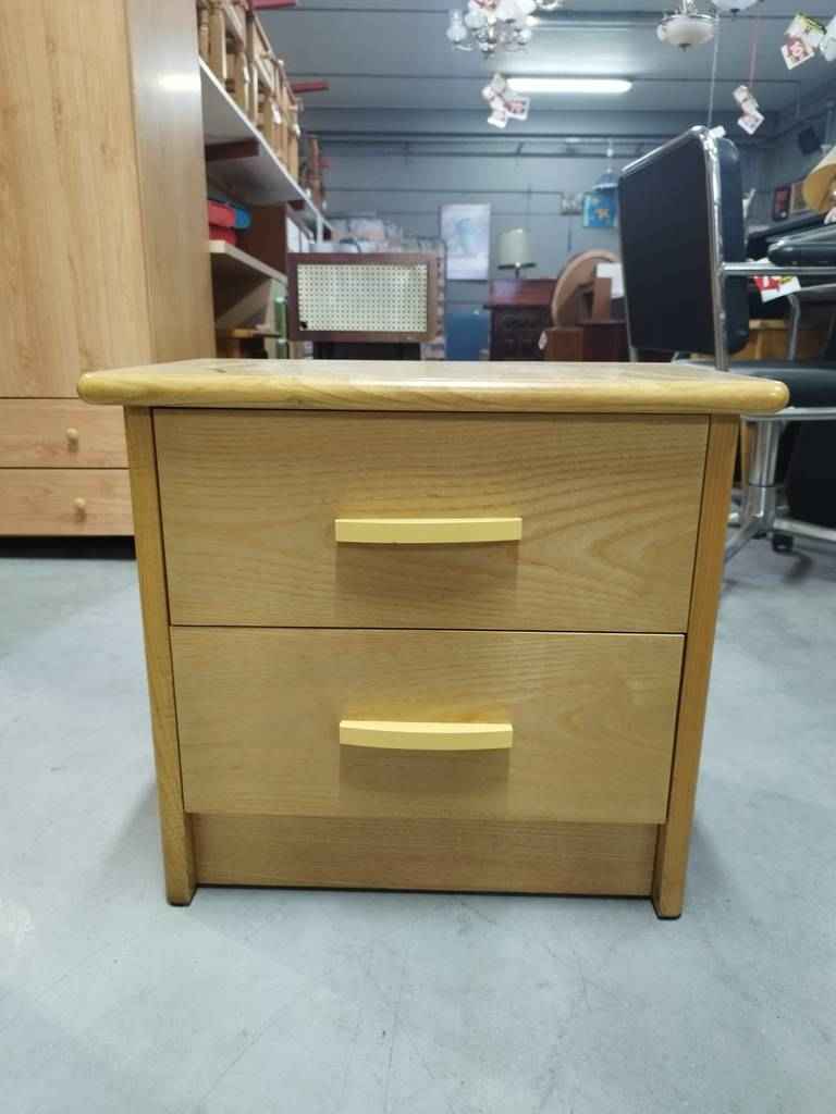 Mesita de noche que ha sido realizada con madera de buena calidad y robusta. Dispone de una parte frontal con dos cajones pequeños que incorporan tiradores de madera en el centro para ser abiertos fácilmente. Es una mesita ideal para colocar en un dormitorio individual al lado de nuestra cama. Como podemos observar en las fotografías se encuentra en buenas condiciones.