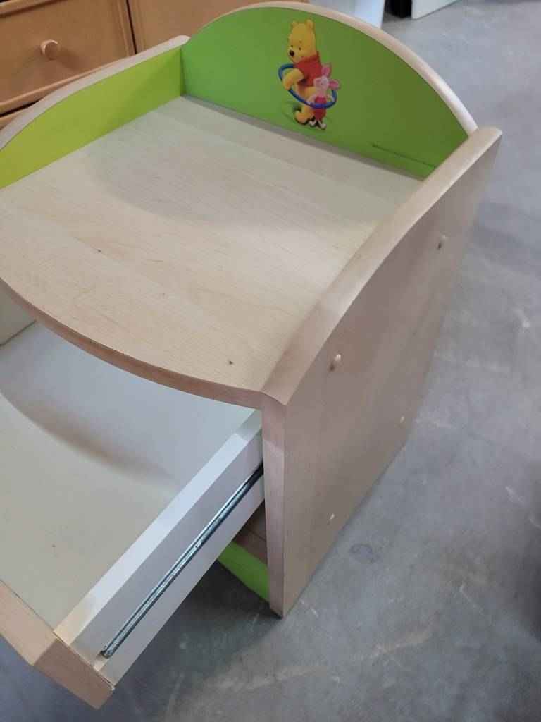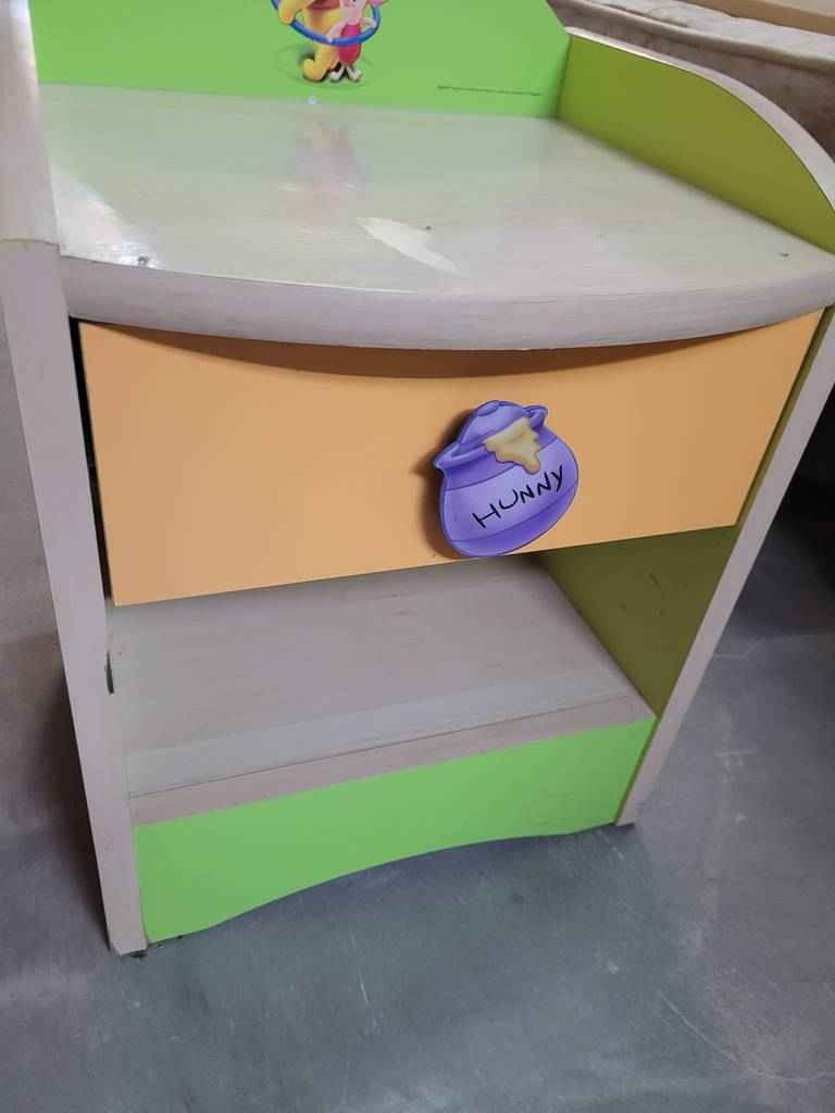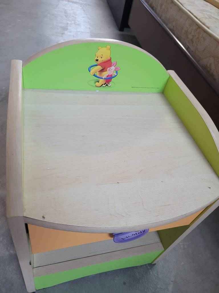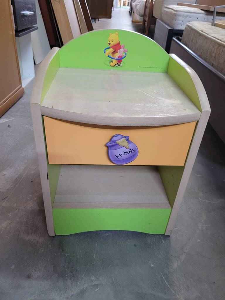 Mesita de estilo infantil con temática del famoso dibujo Winnie The Pooh. Se compone de una parte frontal con un pequeño cajón y un habitáculo en la parte inferior. El cajón dispone de un tirador muy original a modo de bote de miel. En la parte superior podemos observar el dibujo del famoso oso junto con su fiel amigo. Es ideal para una habitación infantil. Como podemos observar en las fotografías se encuentra en buenas condiciones.