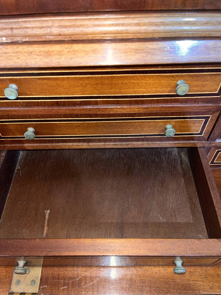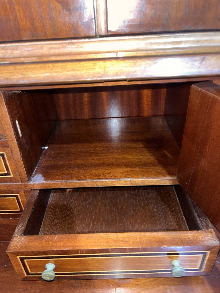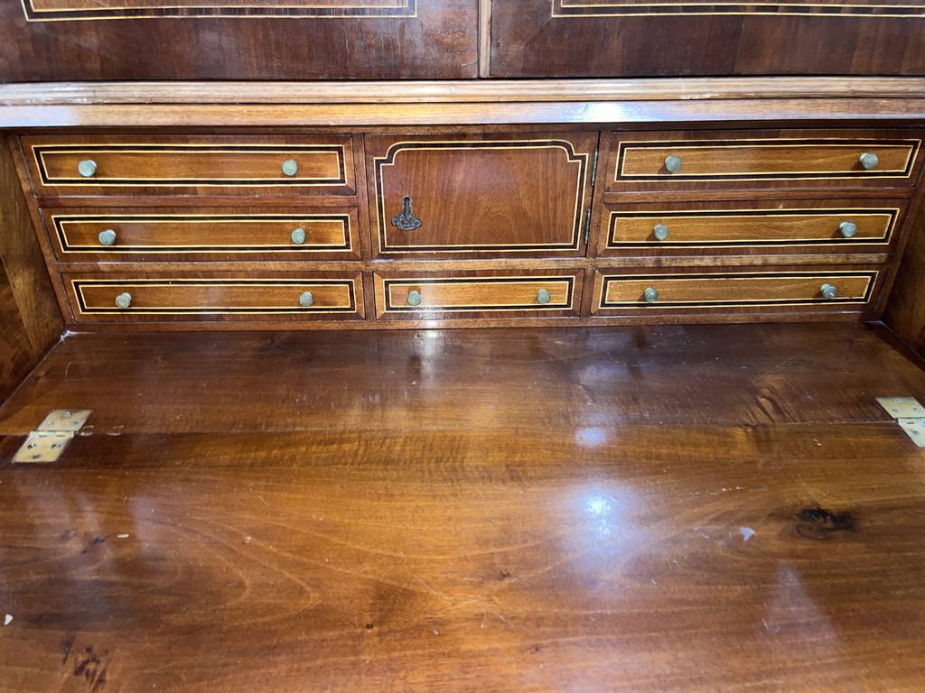 Mueble tipo buró de estilo clásico fabricado en madera de buena calidad de color marrón oscuro. Se trata de un mueble de gran altura que cuenta con tres cajones en la parte inferior con tiradores metálicos, una puerta abatible en la zona central y dos grandes puertas en la parte superior. Es un buró perfecto para colocarlo en un salón comedor de estilo vintage. Como se puede observar en las fotografías se encuentra en buenas condiciones.