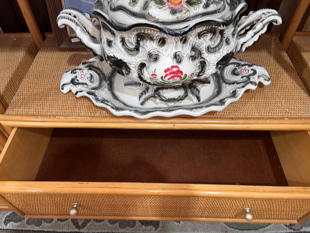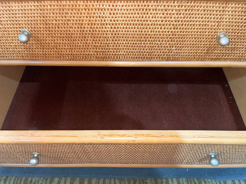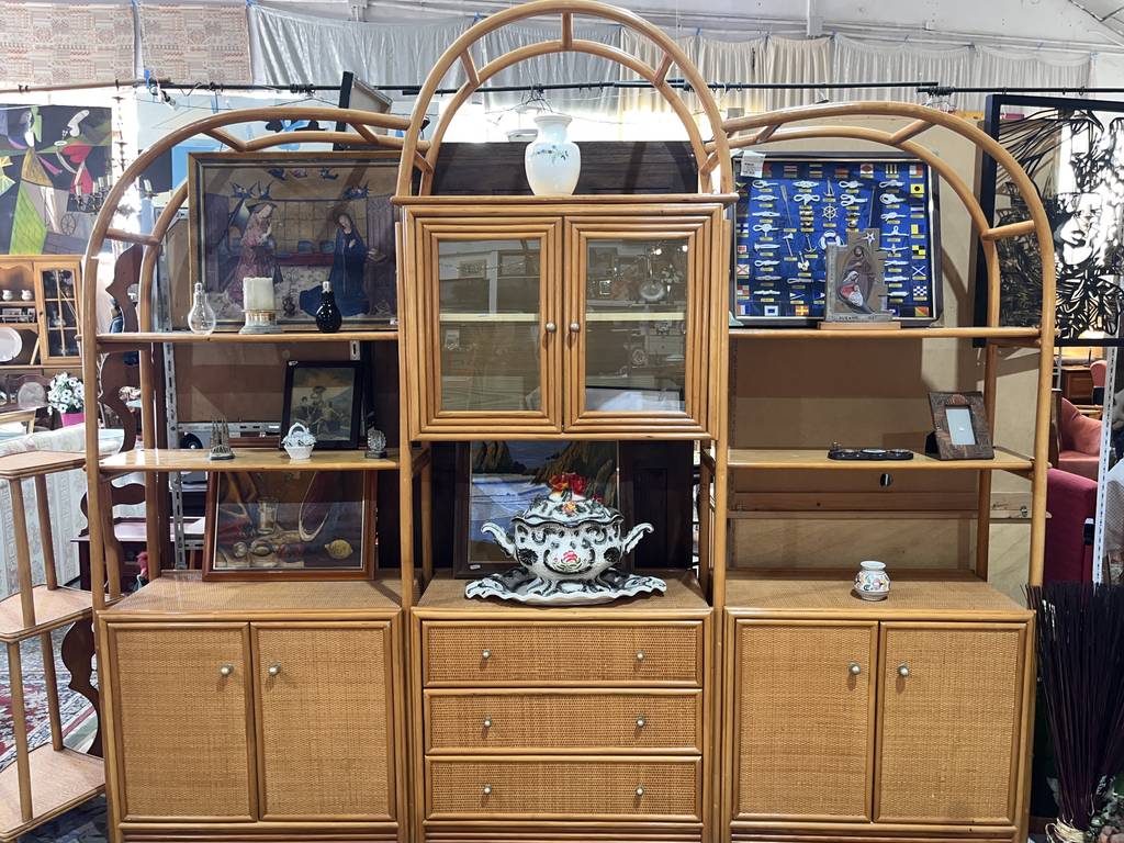 Mueble de comedor de grandes dimensiones fabricado en bambú de color marrón claro. Se trata de un mueble grande que cuenta con cuatro puertas y tres cajones en la parte inferior, tiene varias baldas para colocar objetos y cuenta con dos puertas con cristales en la parte superior. Es un mueble ideal para colocarlo en un salón comedor de estilo rústico. Como se ve en las imágenes está en buen estado.