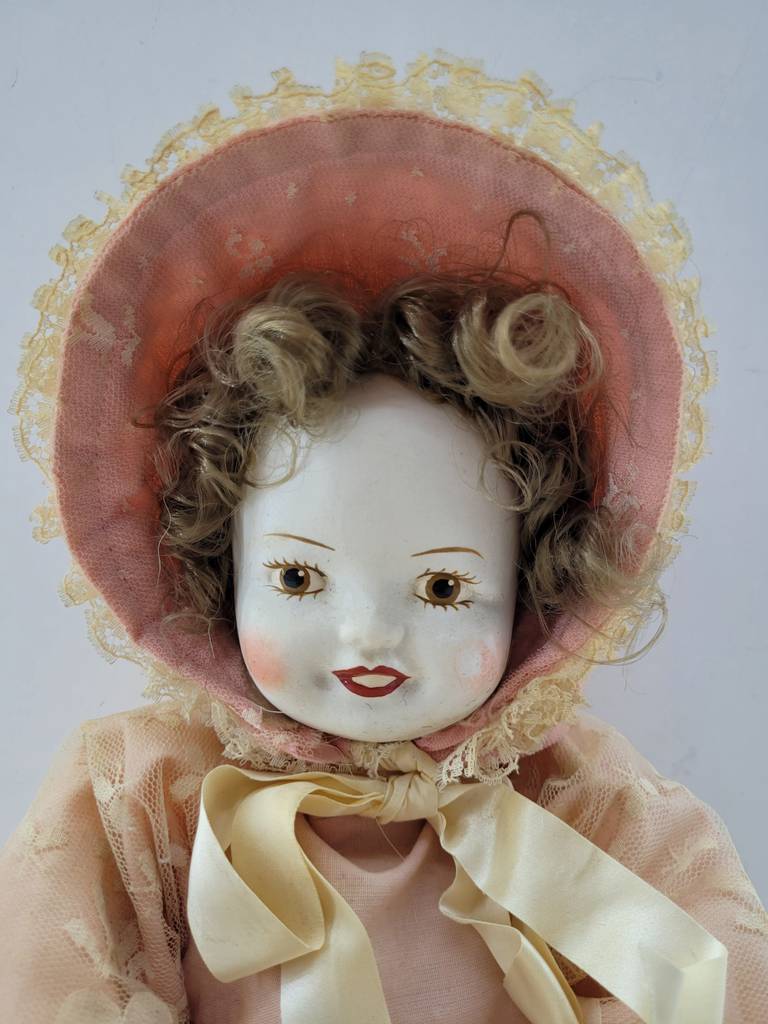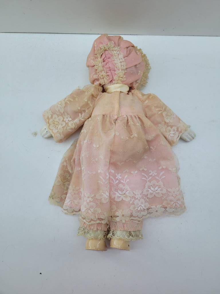 Muñeca de porcelana de tamaño mediano de color blanco vestida con un traje de color rosa. Se trata de una muñeca de porcelana que lleva un vestido rosa y un sombrero de estilo clásico a conjunto. Es una muñeca ideal para colocarla en un salón comedor o en cualquier otra estancia a modo decorativo. Como se puede observar en las fotografías el vestido de la muñeca se encuentra un poco manchado.