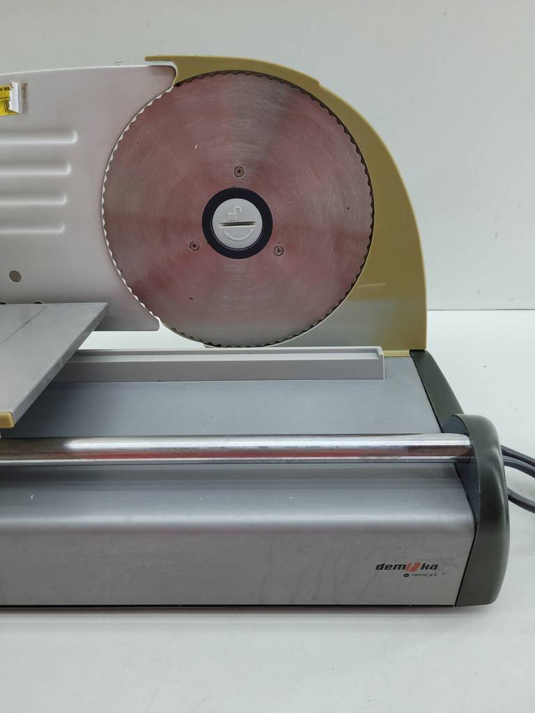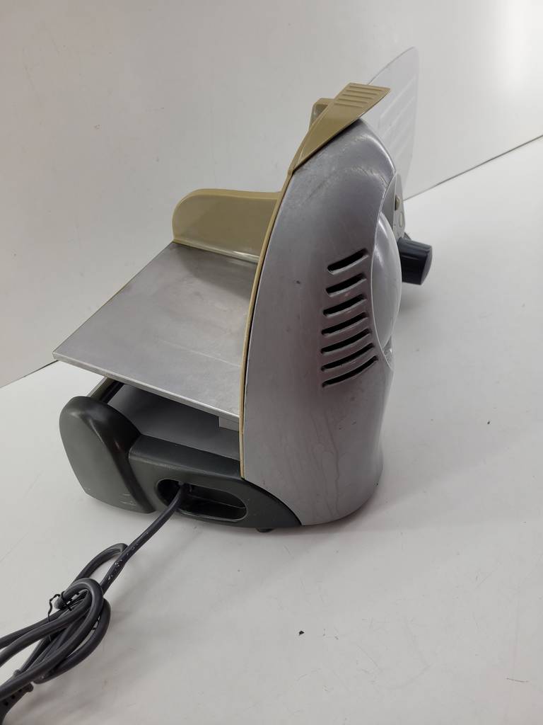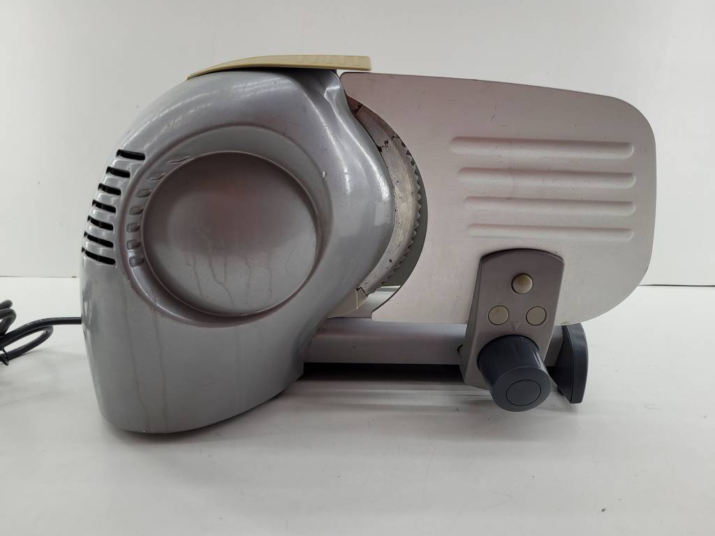 Máquina de cortar fiambre fabricada en un material de buena calidad de color plateado. Se trata de una máquina de cortar fiambre muy práctica para tenerla en la cocina del hogar y utilizarla en el día a día para cortar todo tipo de embutido y companaje. Como se puede observar en las fotografías se encuentra en buenas condiciones y funciona correctamente.