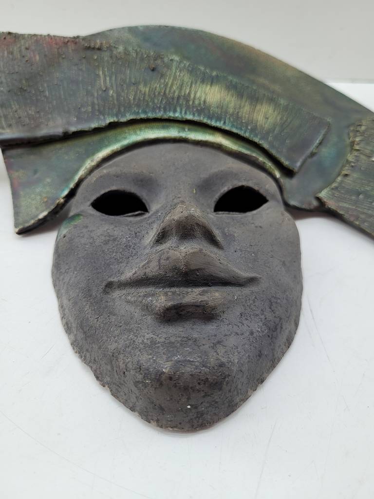 Máscara muy bonita y original realizada en cerámica brillante. Se trata de una máscara con una parte superior con un gorro grande y original. Es una máscara única, ideal para ser colgada en pared y decorar nuestro recibidor o salón comedor aportándole un toque elegante y distintivo a nuestra estancia. Como podemos observar en las fotografías presenta un ligero desgaste, pero cumple su función perfectamente.