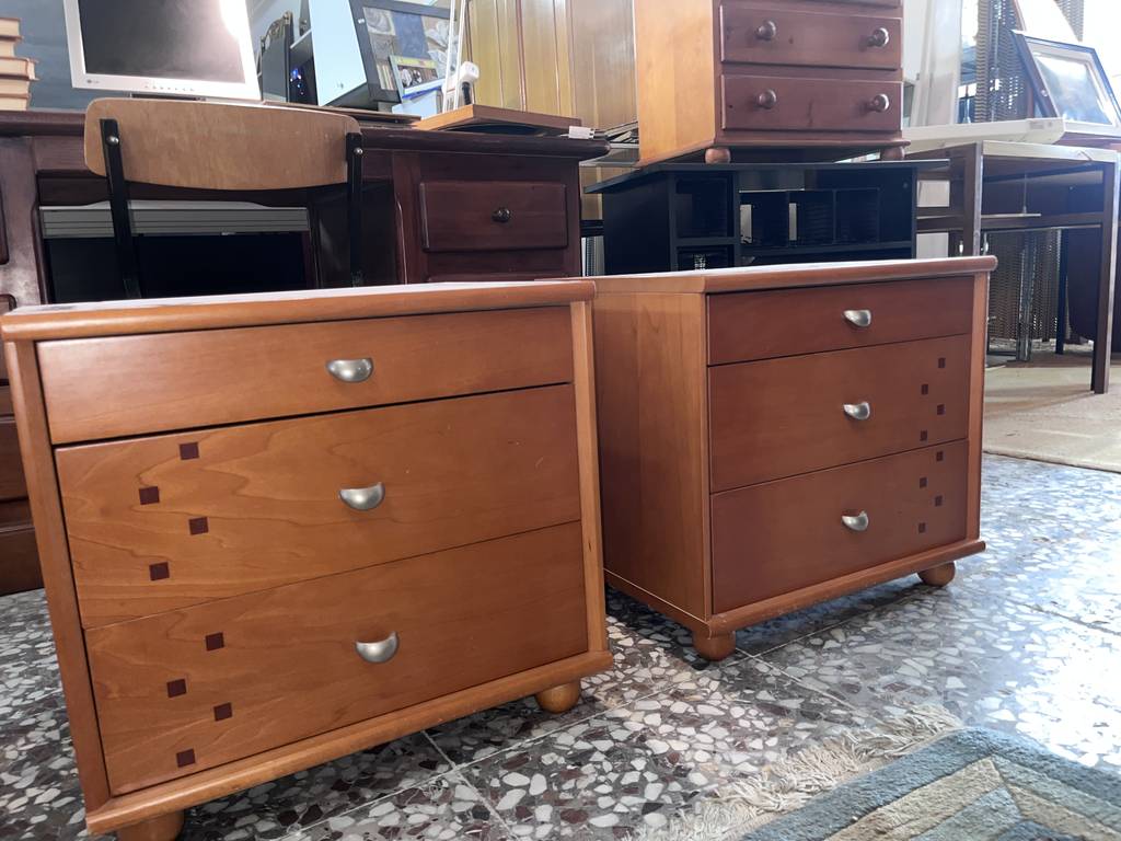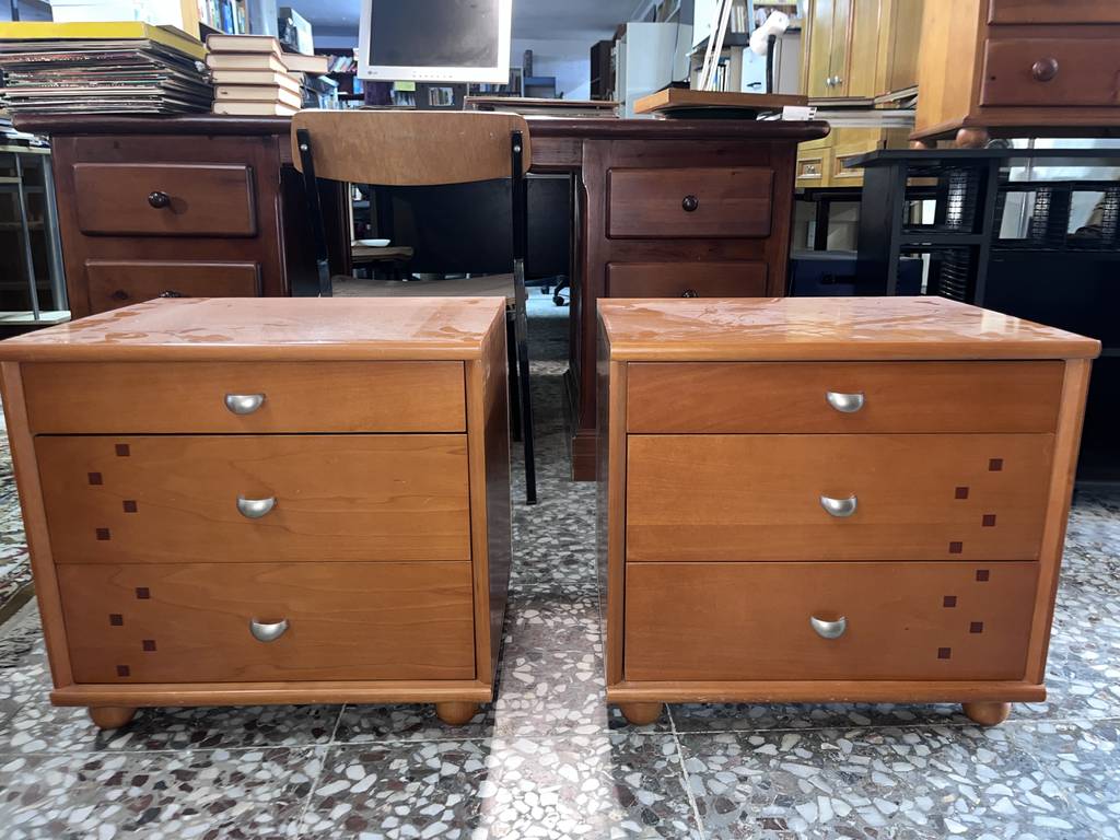Pareja de mesitas de noche que han sido fabricadas con madera de buena calidad y robusta. Se componen de una parte frontal con tres cajones, uno de ellos más pequeño. Todos ellos incluyen un tirador en color plata para abrirlos fácilmente. Son ideales para colocar en un dormitorio junto a la cama. Como podemos observar en las fotografías se encuentran en buenas condiciones.