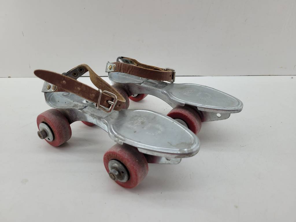 Patines de estilo clásico de la marca Sancheski Irun con cuatro ruedas. Se trata de unos patines con cuatro ruedas cada uno que se atan con unas correas a los pies. Son unos patines ideales si te gusta patinar y disfrutas haciéndolo. Como se puede observar en las fotografías a los patines les faltan las correas delanteras por lo que sería recomendable repararlos.