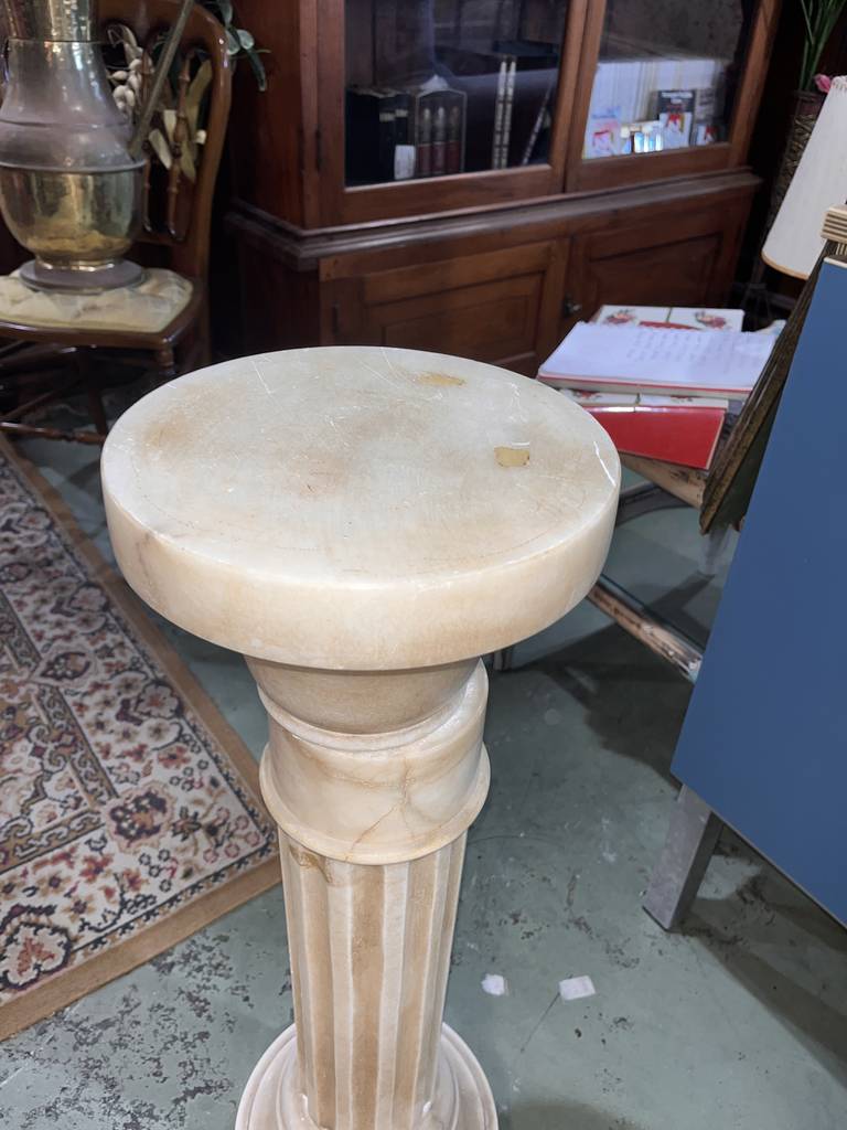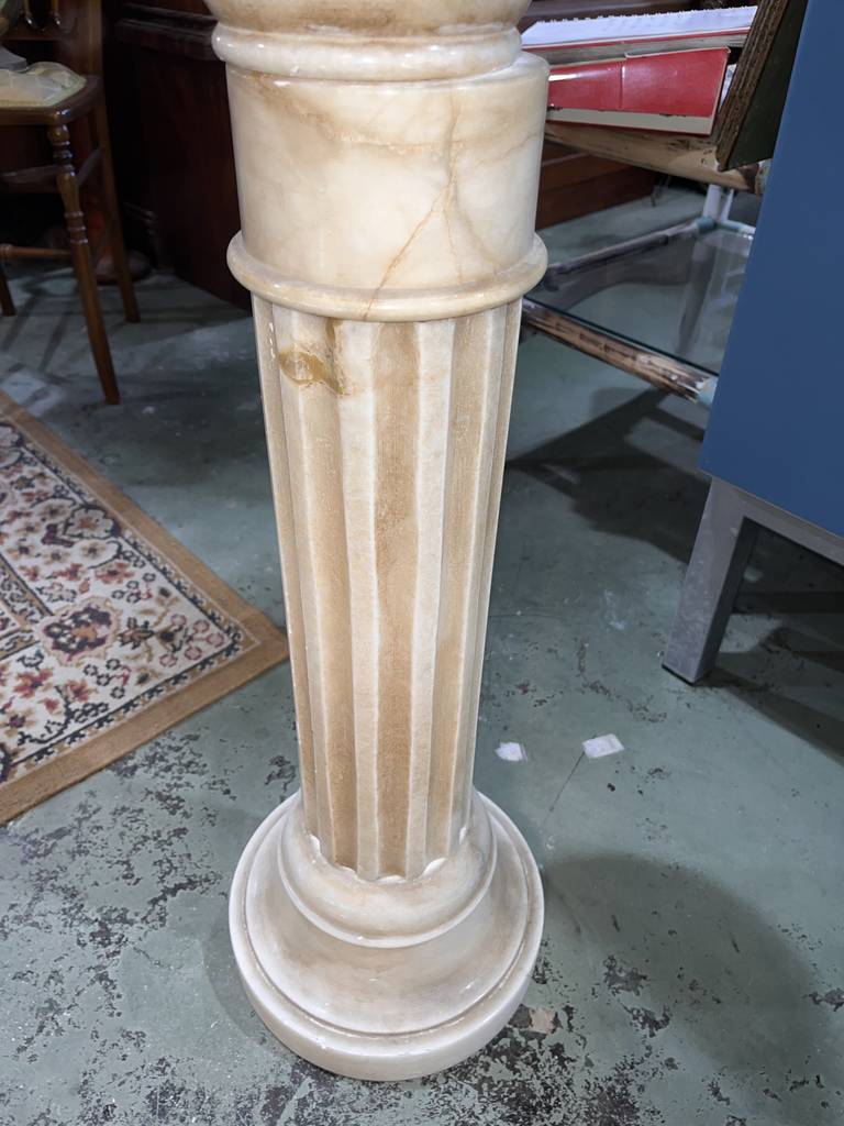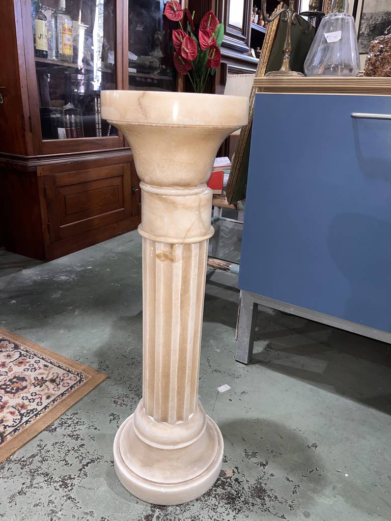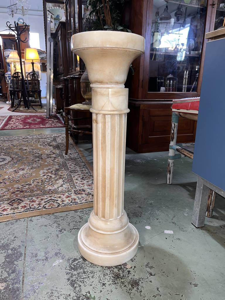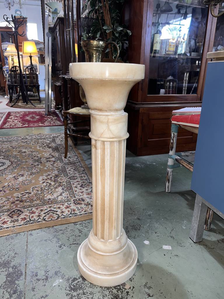 Peana de estilo clásico fabricada en un material robusto y resistente de color blanco y crema. Se trata de una peana de tamaño mediano que tiene una base redonda, una estructura cilíndrica y una superficie redonda también. Es una peana perfecta para ponerla en una zona exterior del hogar o en un salón comedor. Como se puede observar en las fotografías se encuentra en buenas condiciones.