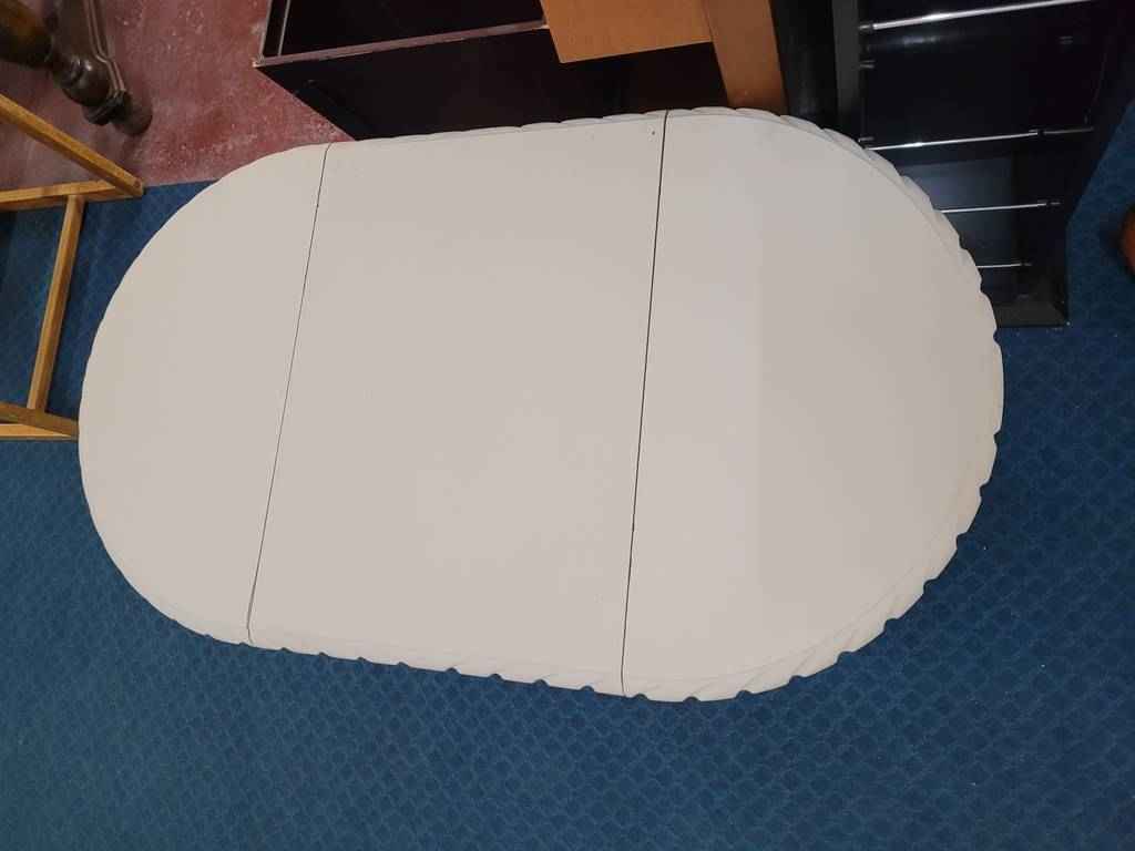 Pequeña mesa de comedor o cocina en color blanco que ha sido fabricada con madera de buena calidad y robusta. Se trata de una mesa de tamaño pequeño que podemos extender gracias a sus dos alas abatibles en los laterales. Es ideal para que no ocupe mucho espacio cuando no le demos uso. Como podemos observar en las fotografías se encuentra en buenas condiciones.