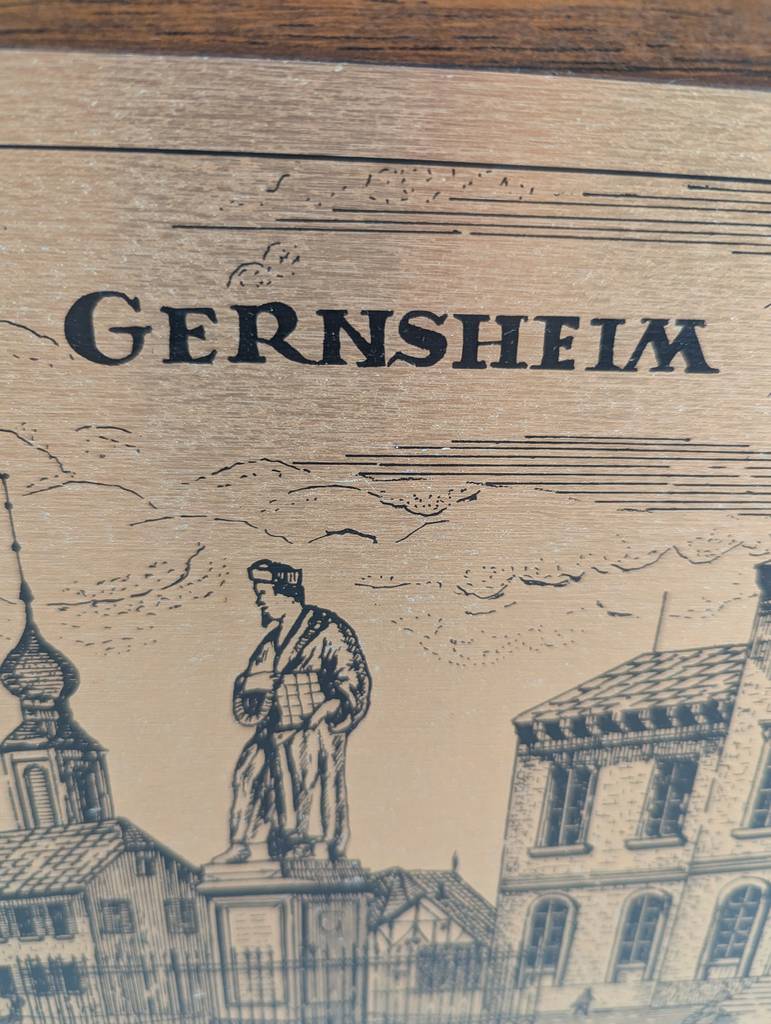Placa enmarcada de la ciudad alemana de Gernsheim. Se trata de una placa de tamaño mediano que está enmarcada con un marco fino de madera de color marrón y tiene el dibujo de la ciudad alemana en blanco y negro. Es una placa ideal para colocarla en un salón comedor como elemento decorativo. Como se puede observar en las fotografías se encuentra en buenas condiciones.