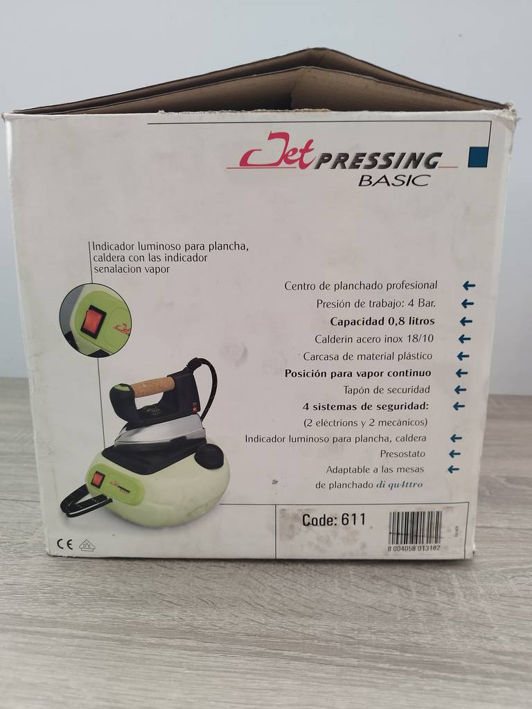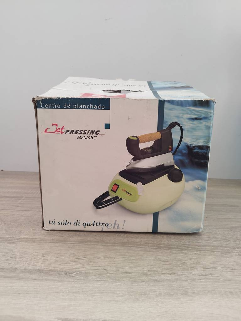 Centro de planchado profesional de la marca Jetpressing Basic. Se trata de una plancha que viene acompañada de un soporte en el que reposa y tiene una capacidad de 0,8 litros. Dispone de cuatro sistemas de seguridad y un indicador luminoso. Es una plancha ideal para tenerla en el hogar para planchar prendas de ropa. Como se puede ver en las fotografías se encuentra en buen estado y funciona correctamente.