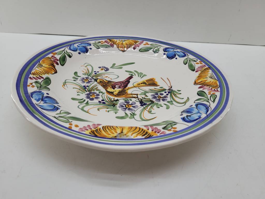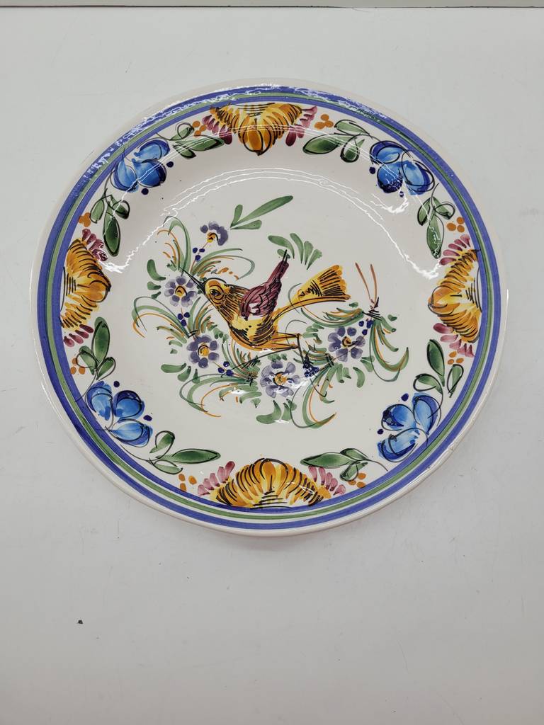 Plato antiguo con una decoración muy bonita y alegre con colores multicolor de flores y hojas. En la parte central tiene un pájaro pintado que lo hace resaltar. Es ideal para colgar en una cocina o porche. En la parte posterior dispone de un gancho para colgarlo fácilmente en la pared. Como podemos observar en las fotografías se encuentra en buenas condiciones.
