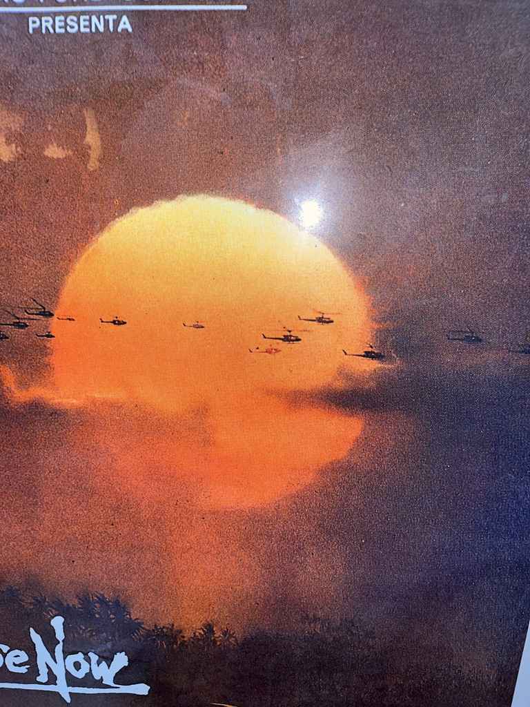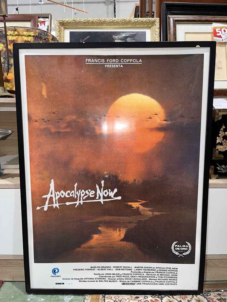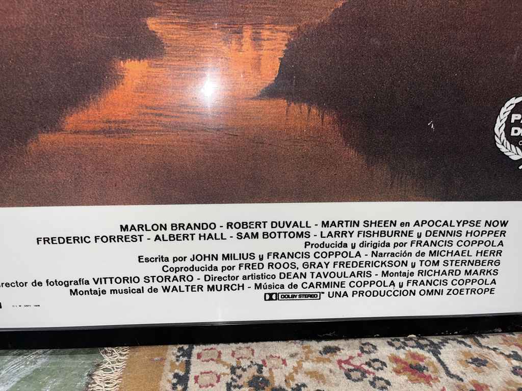 Póster de gran tamaño con una forma vertical de la famosa película de finales de los años setenta Apocalypse now. Se trata de un gran póster enmarcado en un fino marco de color negro en el que aparece un paisaje de la película y el nombre del reconocido director Francis Ford Coppola. Es un póster ideal para colocarlo en el hogar si eres fan de esta gran película. Como se puede observar en las fotografías se encuentra en buenas condiciones.