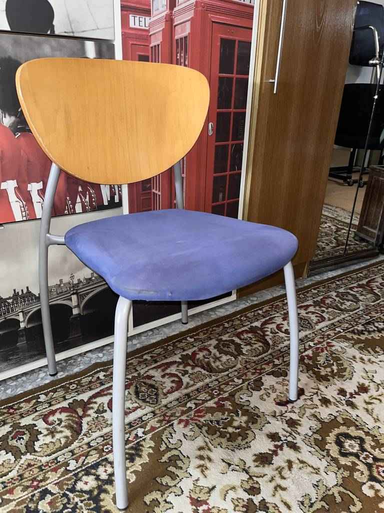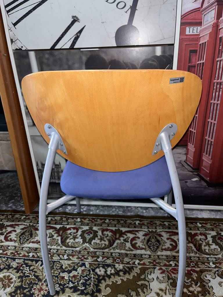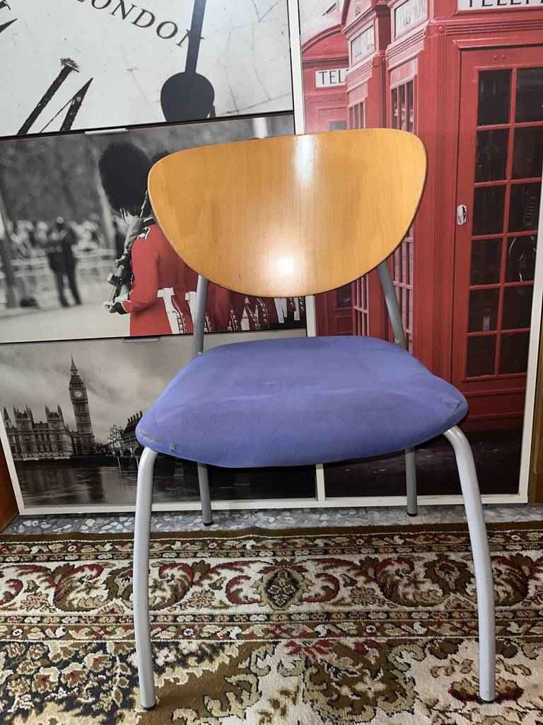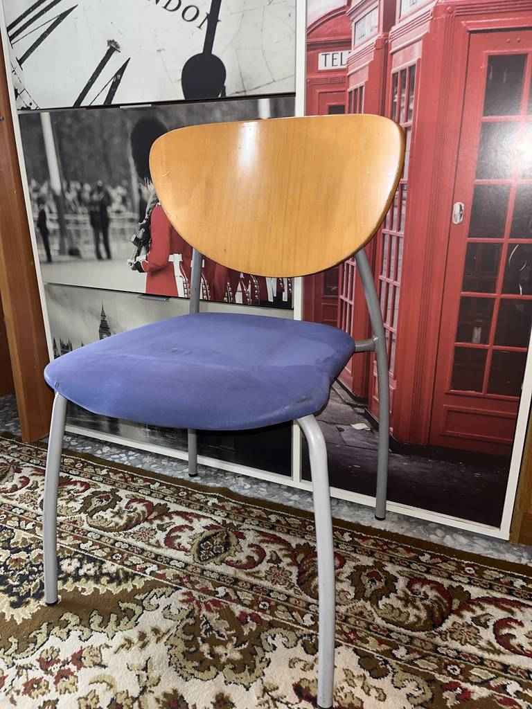 Silla de oficina que dispone de una estructura de metal de buena calidad. Su respaldo es de madera de buena calidad y robusta. Su asiento es de color azul y con un tapizado de tela suave y agradable al tacto. Es ideal para colocar en una oficina o en salas de espera. Como podemos observar en las fotografías presentan un pequeño desgaste pero en general se encuentran en buenas condiciones.