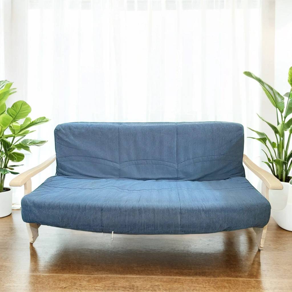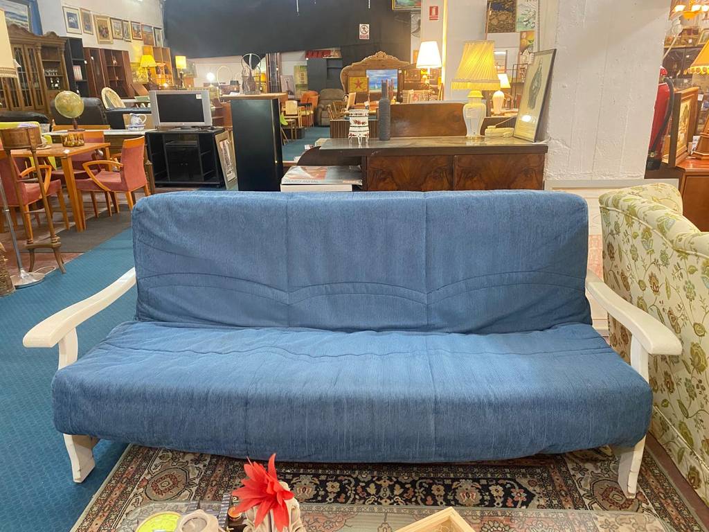 Sofá de tres plazas en color azul con una estructura fabricada en madera de buena calidad y robusta en color blanco. Dispone de unos asientos y respaldos con cojines gruesos cómodos y acolchados así como una funda muy suave y agradable al tacto. Es ideal para colocar en un salón comedor. Como podemos observar en las fotografías se encuentra en buenas condiciones.