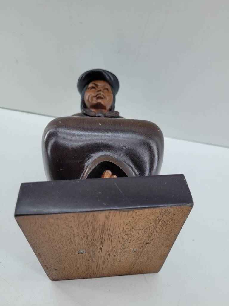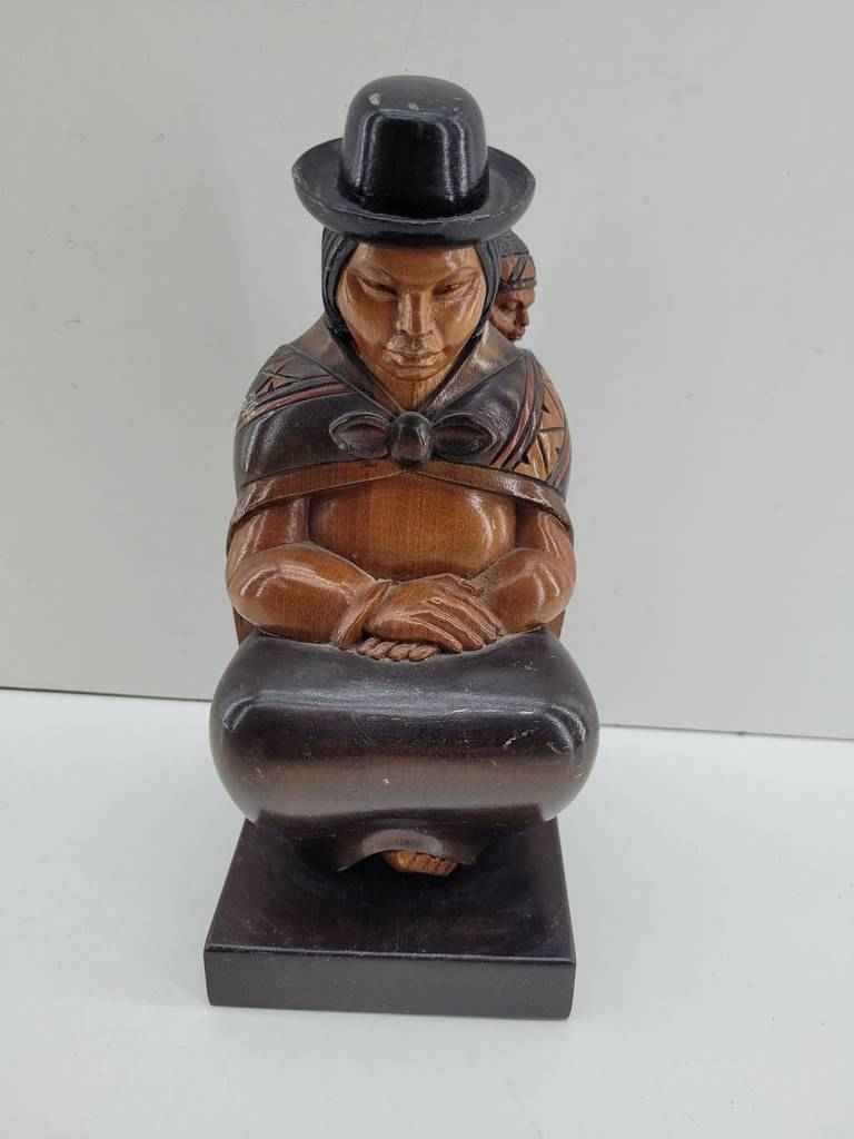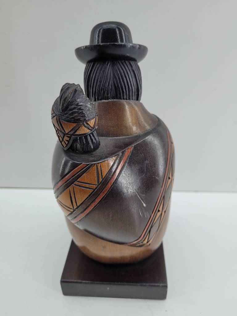 Talla de madera que representa una cholita de Bolivia con su hijo a la espalda. Se trata de una figura tallada en madera de buena calidad de color marrón claro y oscuro que representa a una mujer denominada cholita en Bolivia que va acompañada de su hijo pequeño. Es una figura perfecta para colocarla en un salón comedor a modo decorativo. Como se ve en las imágenes está en buen estado.