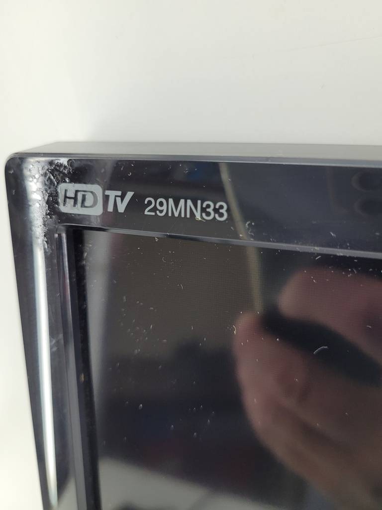 Televisión o monitor de la reconocida marca de electrodomésticos LG de veintinueve pulgadas. Se trata de una televisión de color negro que viene sin mando y sin peana que la sostenga, por lo que se recomienda colgar de la pared de un salón comedor o de un dormitorio. Como se puede observar en las fotografías se encuentra en buenas condiciones y funciona correctamente.