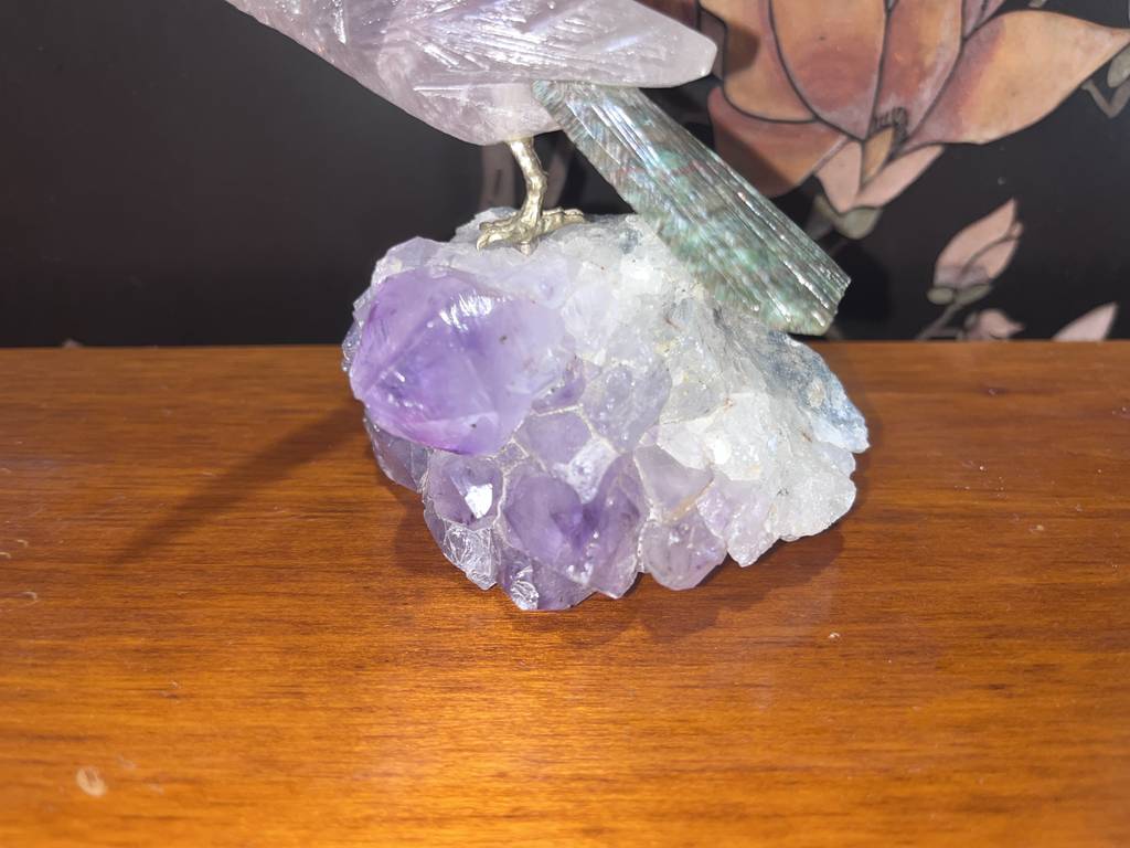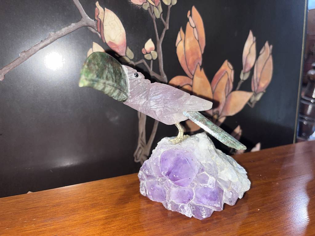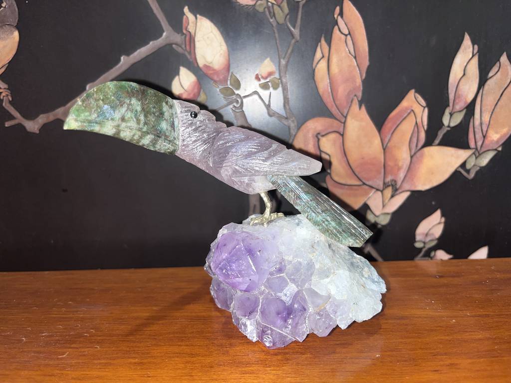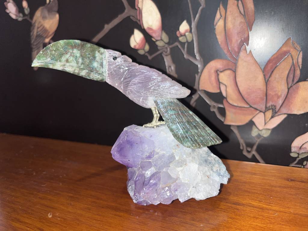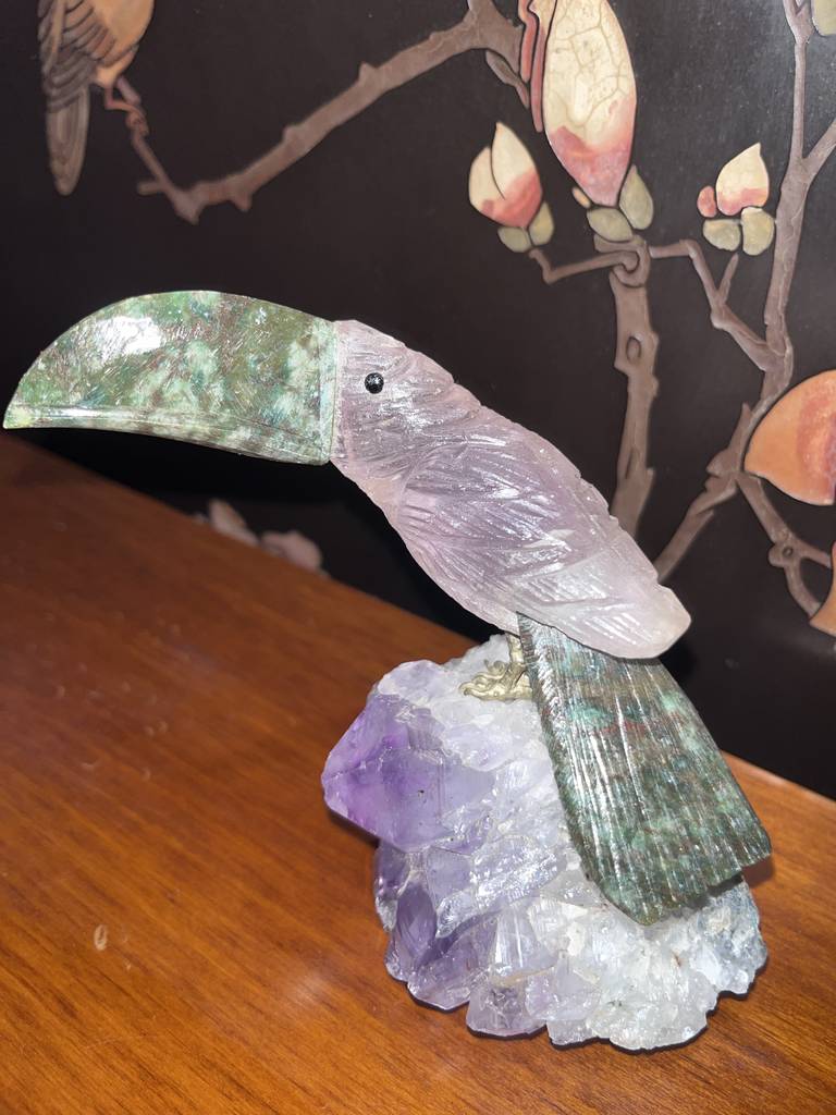 Figura de un tucán realizado en cuarzo que data de los años 60. El tucán está posado sobre unas piedras con tonalidades de color lila. Se trata de una pieza única ideal para coleccionistas o para aportar un toque distintivo a nuestra casa, por ejemplo, en un salón comedor o un recibidor. Como podemos observar en las fotografías se encuentra en buenas condiciones.