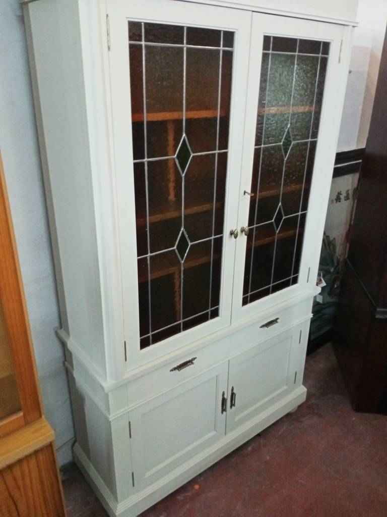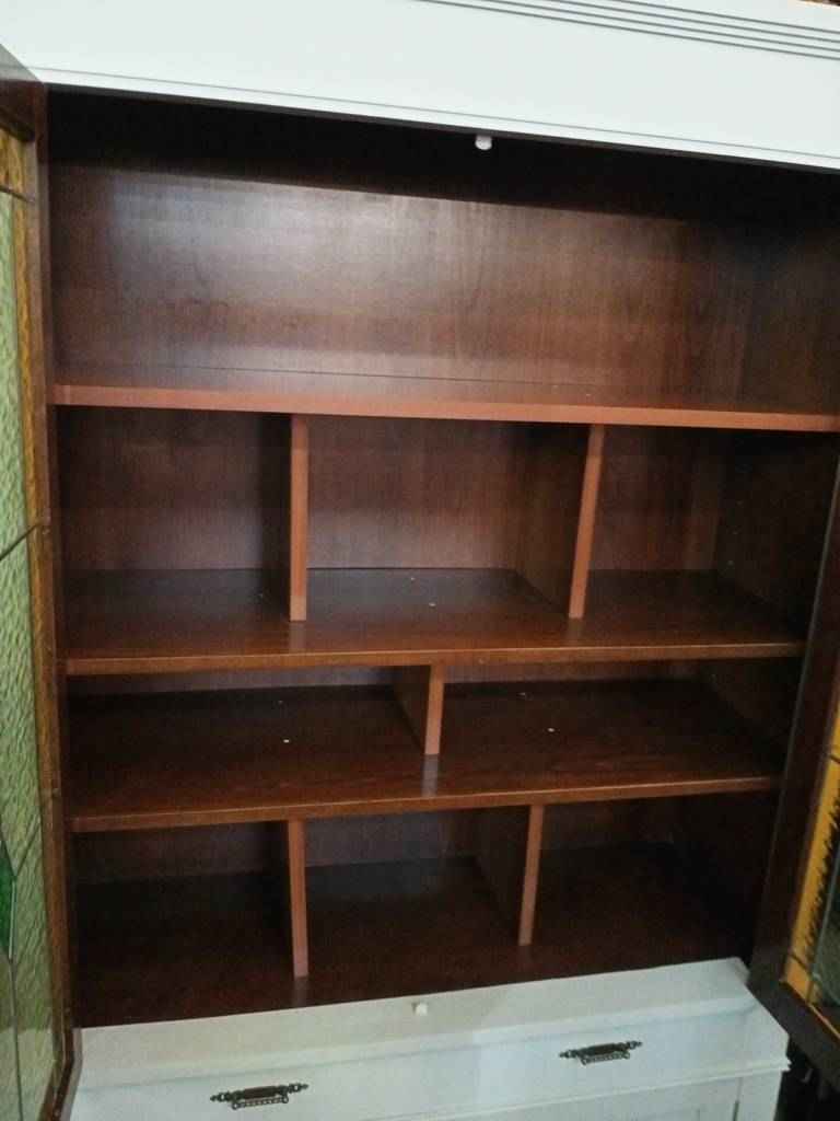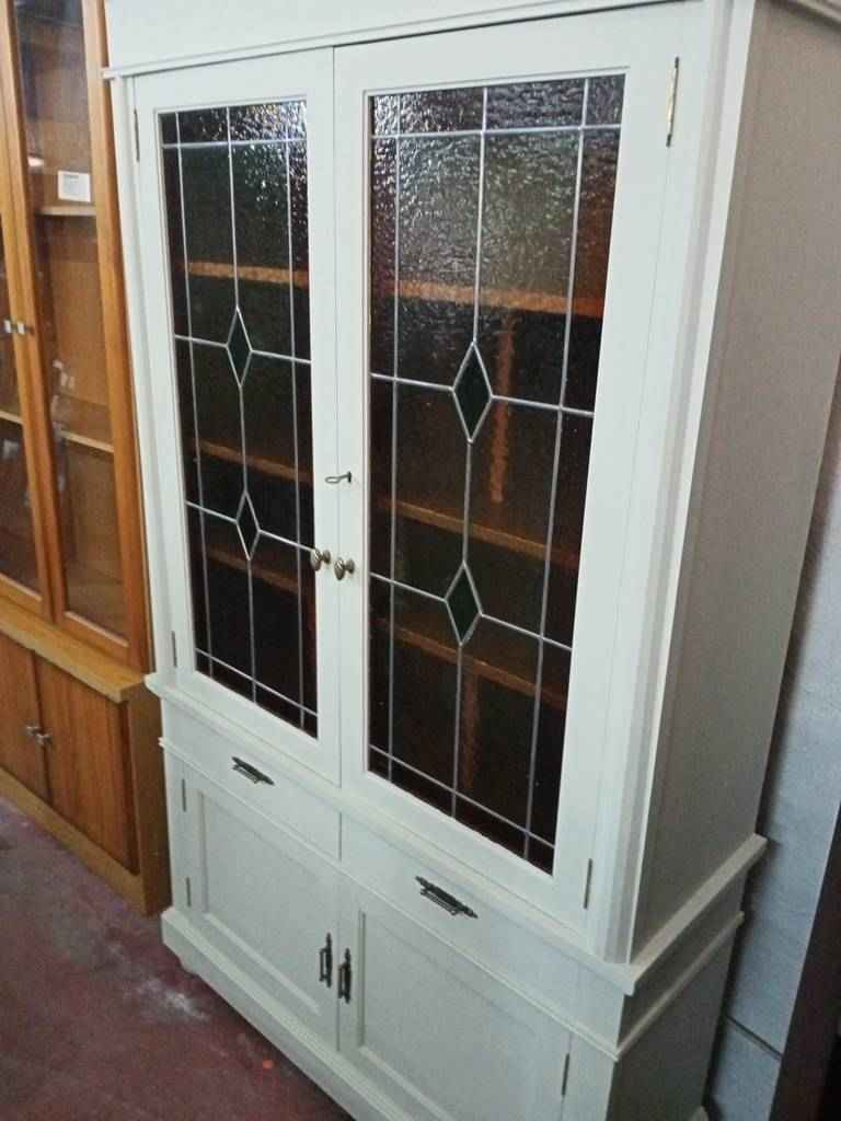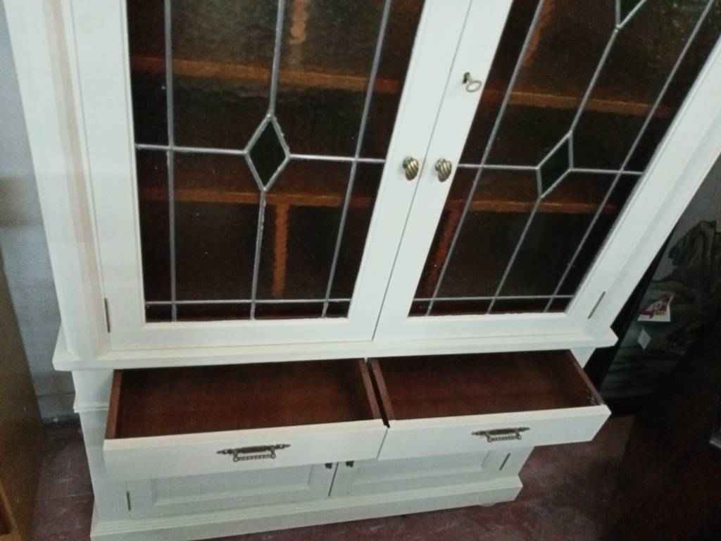 Vitrina en color blanco que ha sido fabricada con madera de buena calidad y robusta. Se compone de dos puertas en la parte superior a modo de vitrina con cristal de varios colores. En la parte media tiene dos cajones y en la inferior dos puertas de tamaño pequeño. Es una vitrina ideal para colocar en un salón comedor. Como podemos observar en las fotografías se encuentra en buenas condiciones y está completamente restaurada. Dispone de llave.