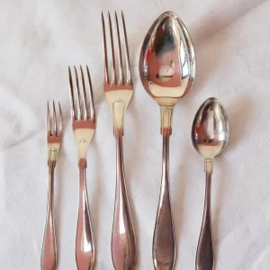 Set of 10 table knives signed E.B (Henri Emile Brille) in Louis XV style. Metal argenté (Silver Plated – 18 top quality) and stainless steel. c. 1940. One of the knives shows a small flaw on the blade, otherwise, good condition. Dimensions and weights: 25,5 cm (1103 grams). We ship worldwide. Shipping costs will be added at checkout.