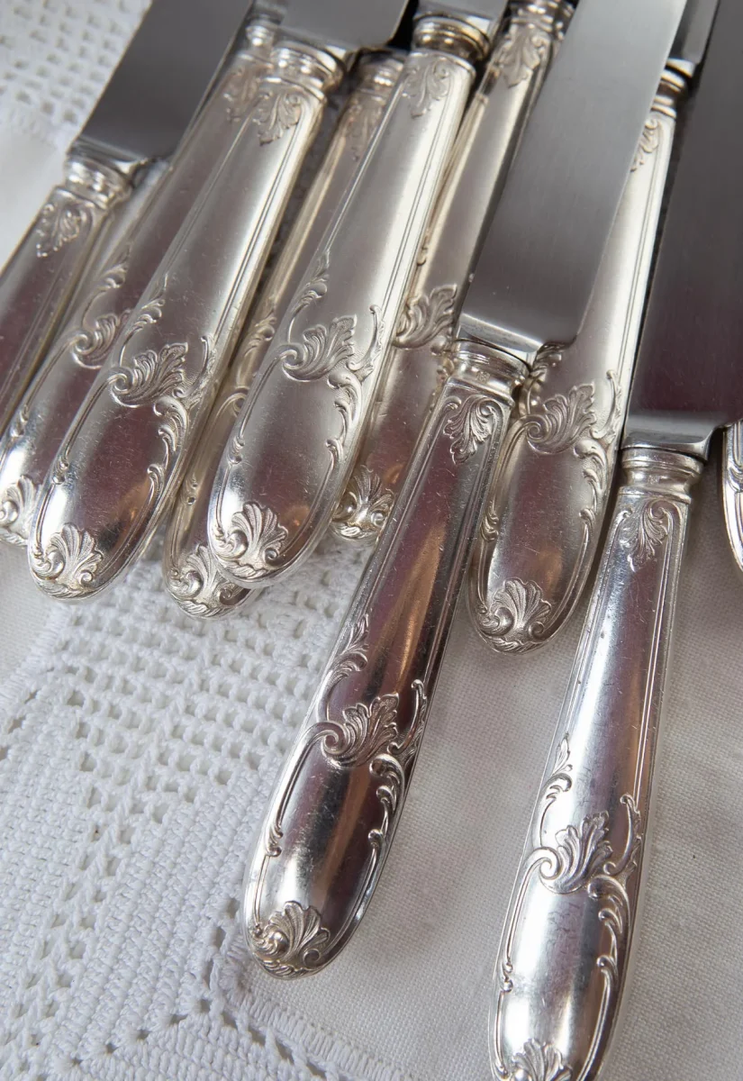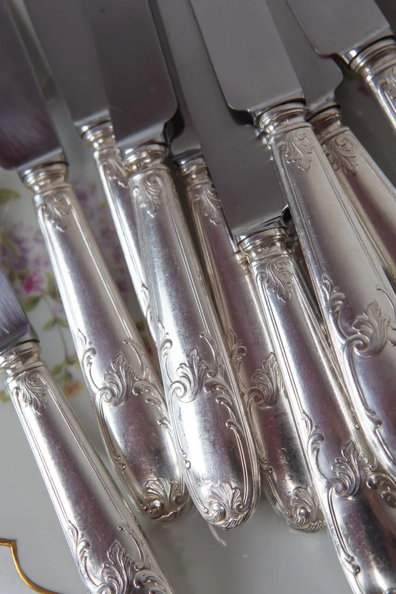 Juego de 10 cuchillos de mesa con mangos en metal plateado decorados en estilo Luis XV / Rococó y hojas de acero inoxidable. Datados hacia 1940s, llevan el cuño del orfebre Henri Emil Brille y reflejan la refinada tradición orfebre francesa. La marca del baño de plata es de 18 lo que indica su gran calidad.