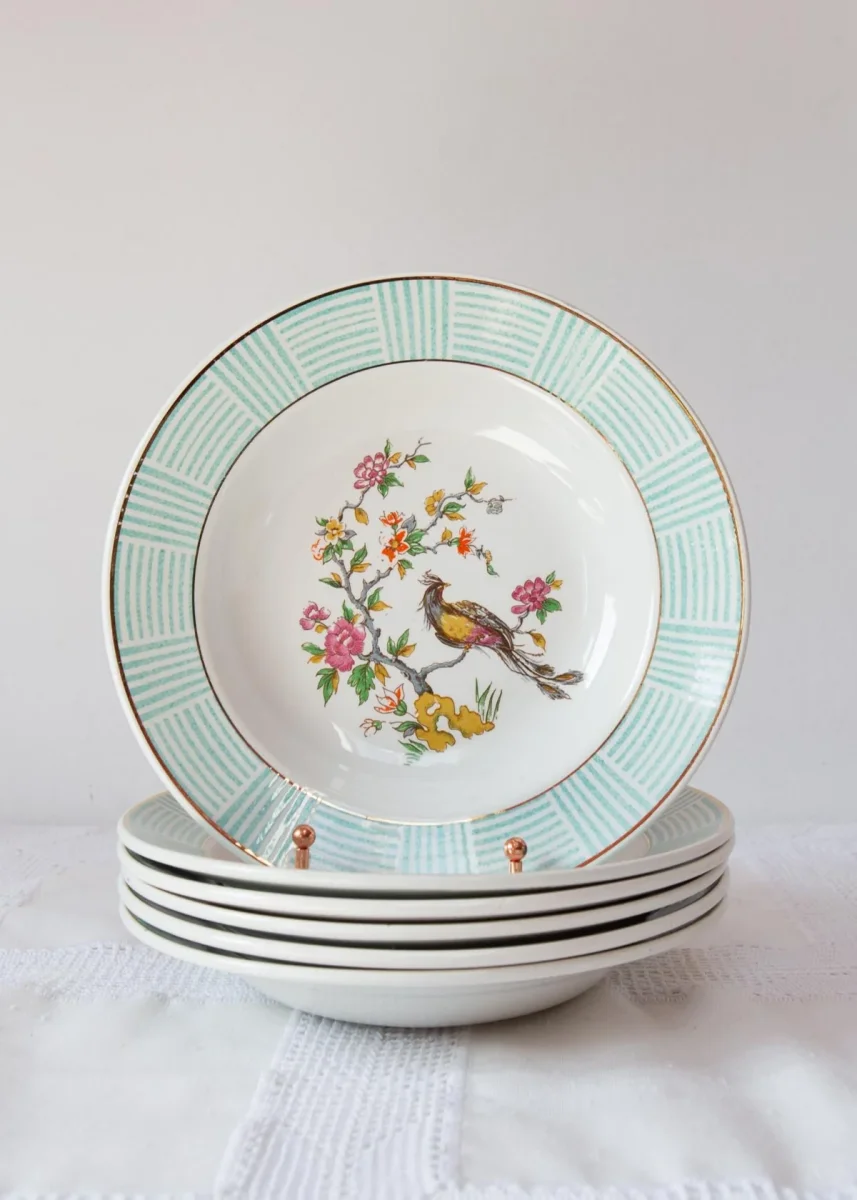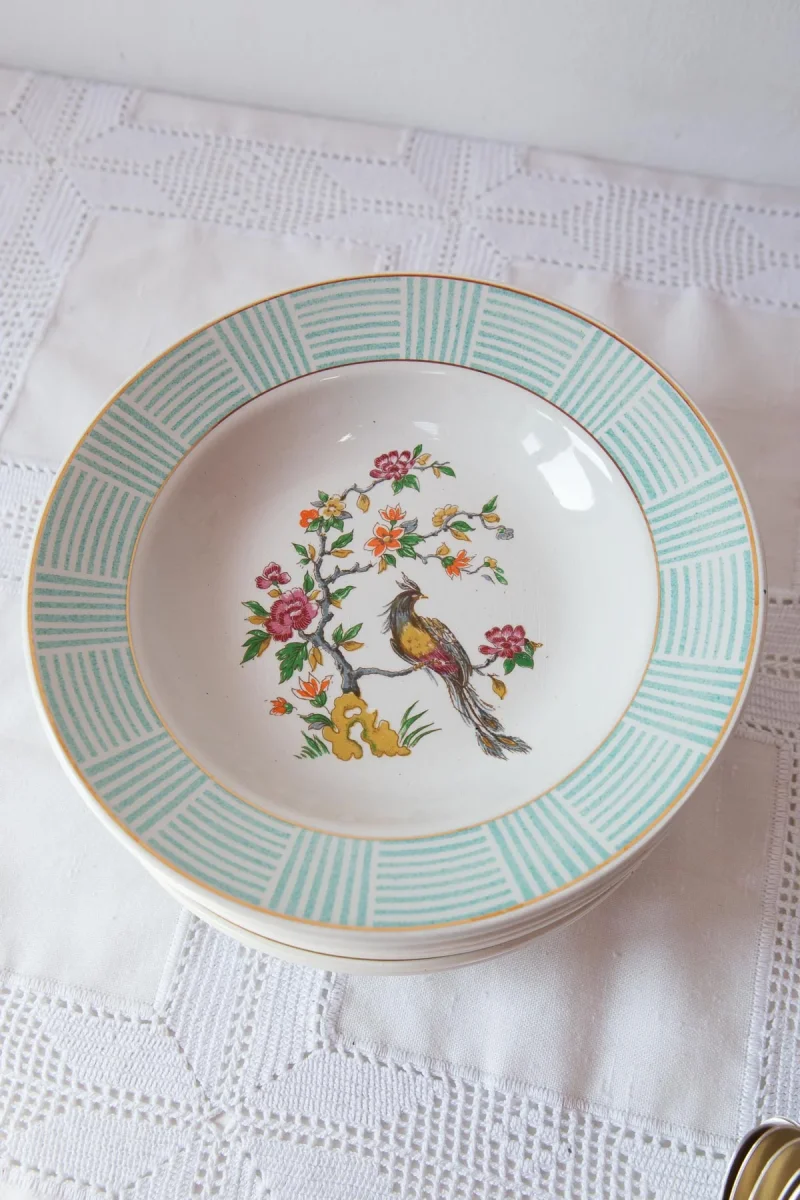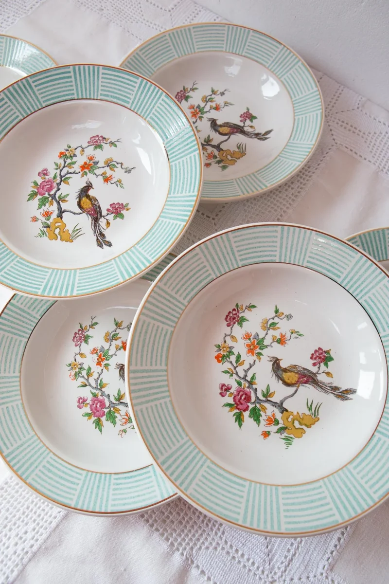 Juego de 6 platos hondos de loza francesa firmada Badonviller de aprox. 1960. Nos encanta su motivo con un ave del paraÃso y el aro exterior en tono verde agua. Libres de golpes y muescas aunque con algo de uso y ligero craquelado en el esmalte. Las fotos dan las mejor descripción