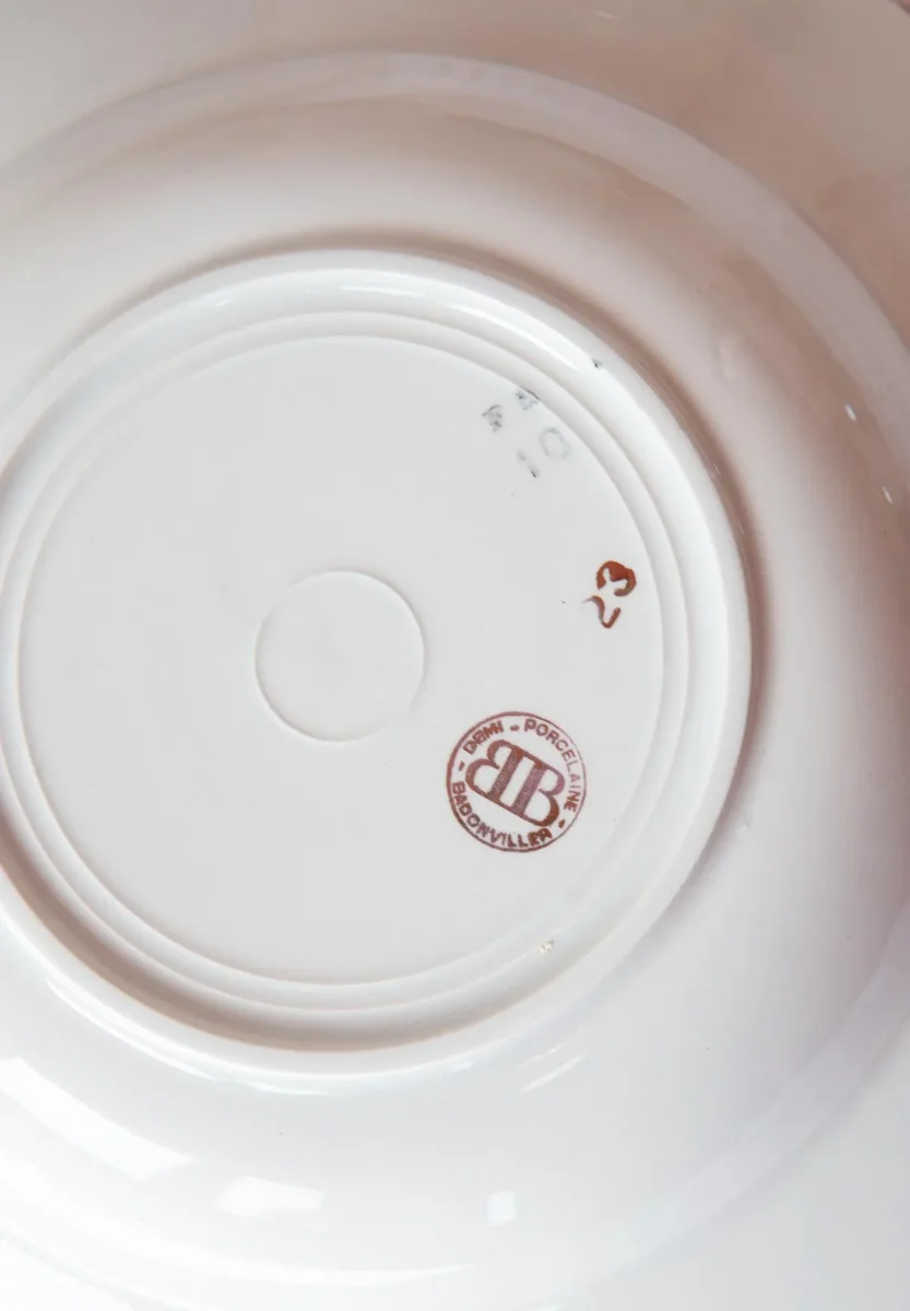 Ensemble de 6 assiettes creuses Badonviller vers 1960. sans felures ni éclats. 2 LOTS DISPONIBLES. Dimensions: ⌀ 23 cm, 4,5 cm haut. Les frais d’expédition seront ajoutés dans le panier