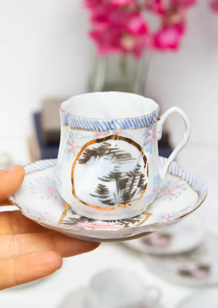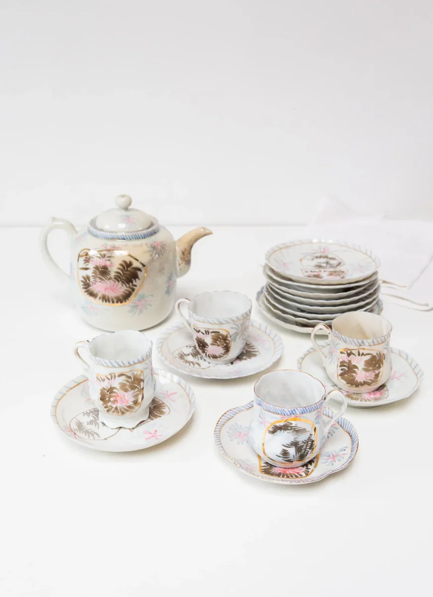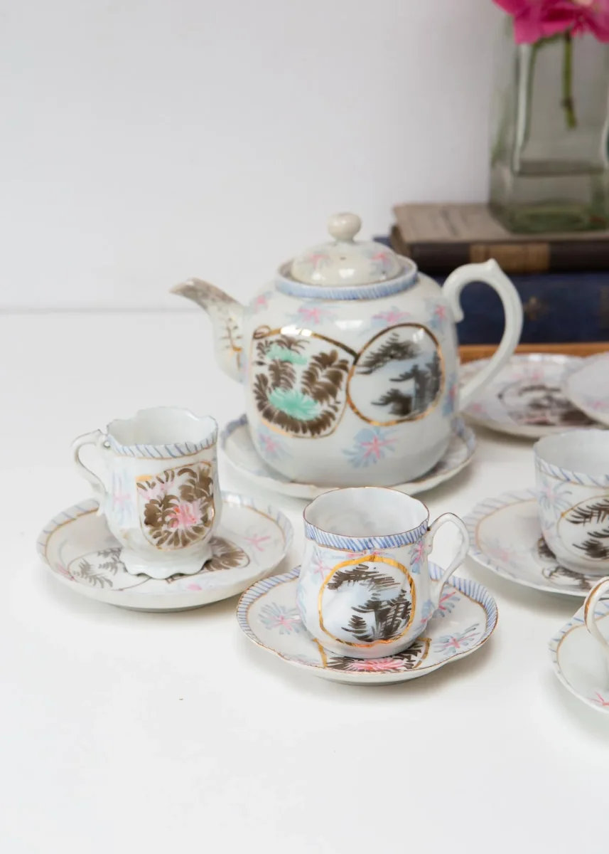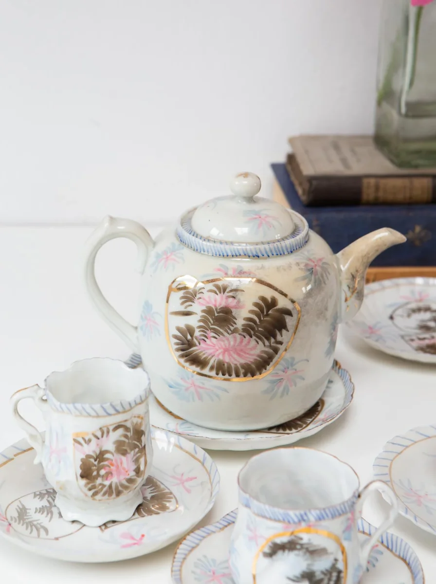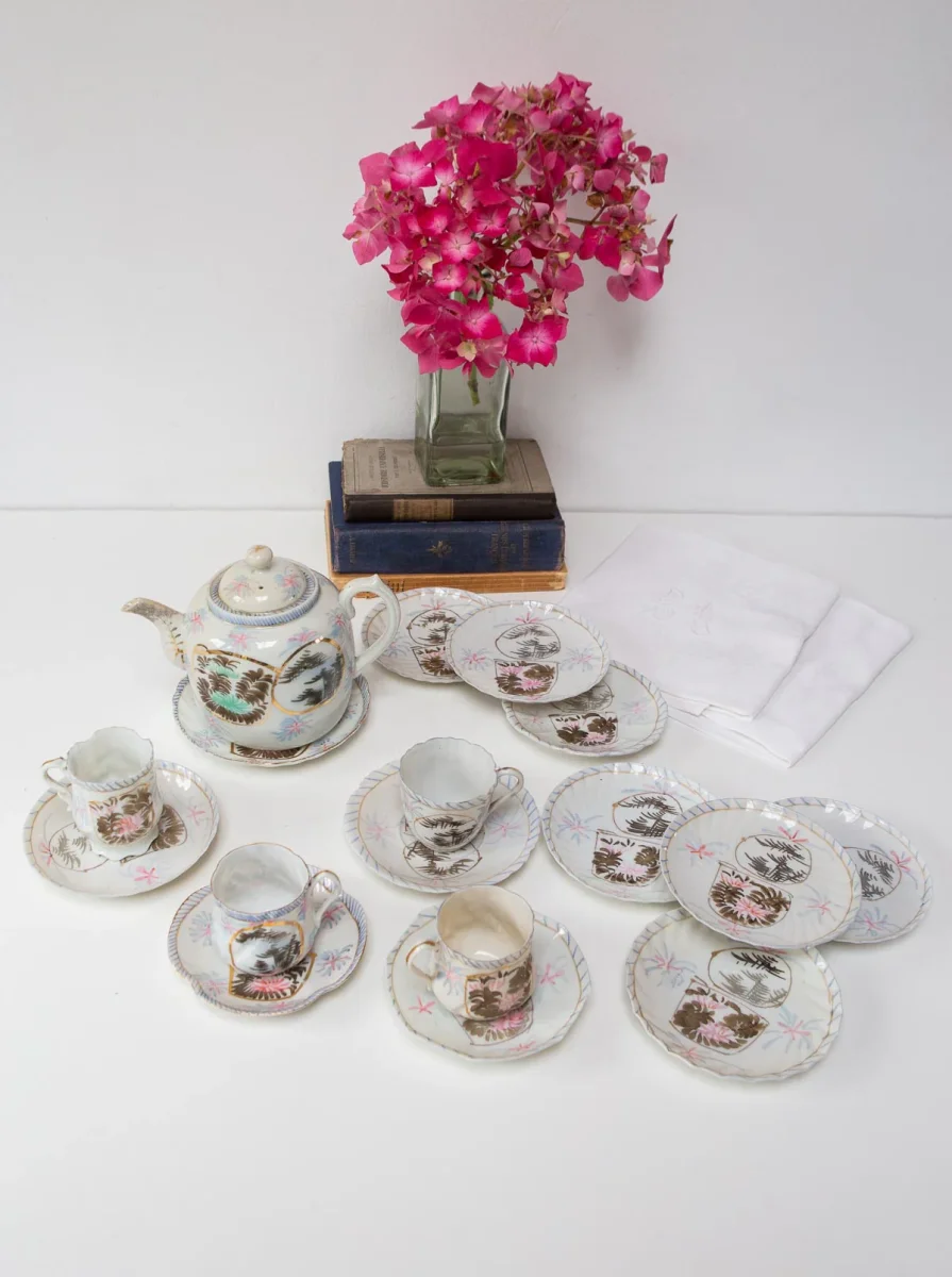 Un conjunto de finísima porcelana china pintado completamente a mano. Es tan fina que puede ser considerada como de «cáscara de huevo». No lleva firma pero su antigüedad y la calidad de su manufactura salta a la vista. VENDIDO