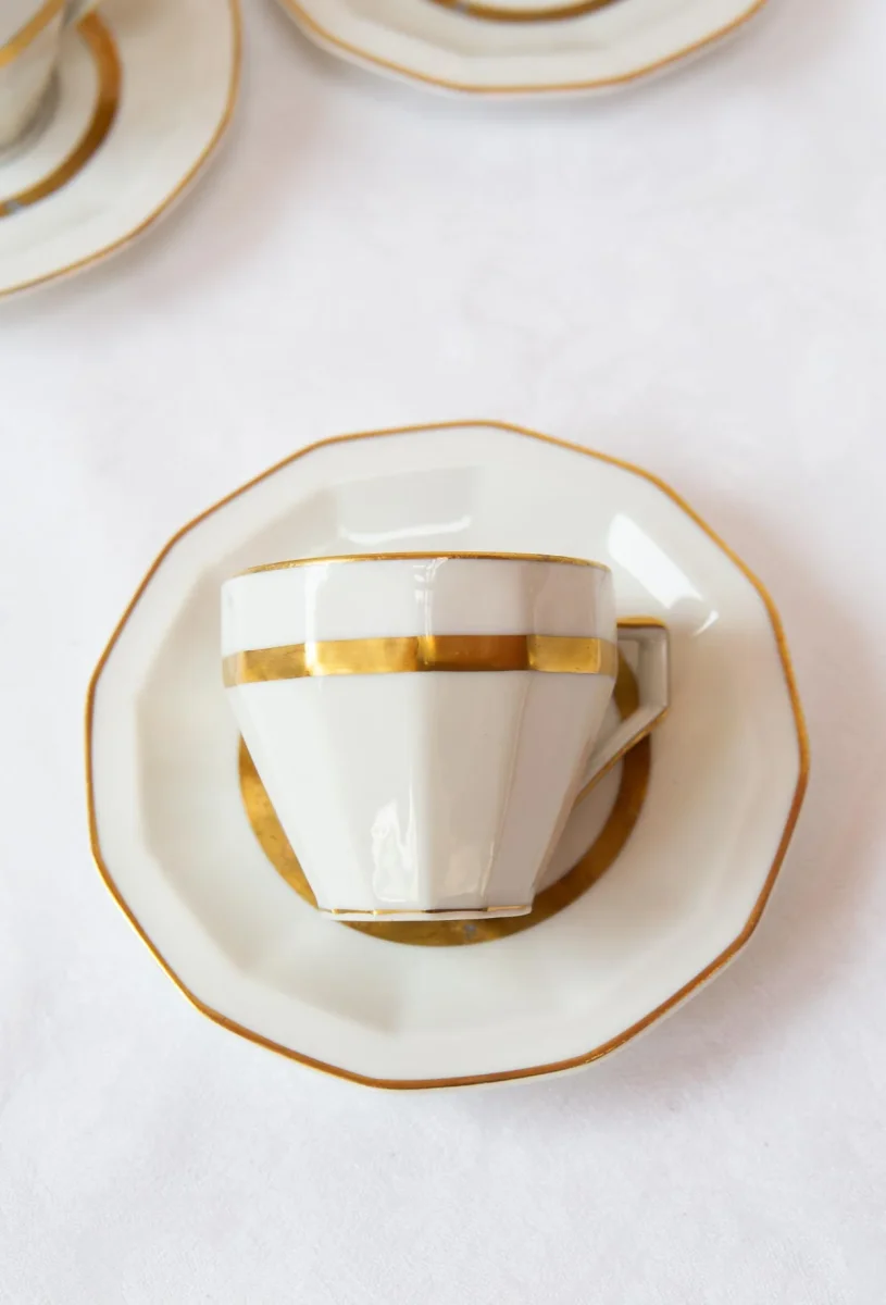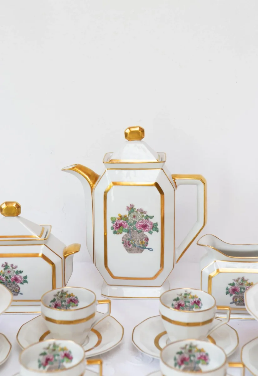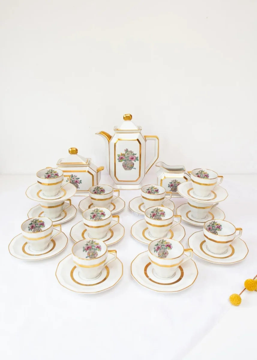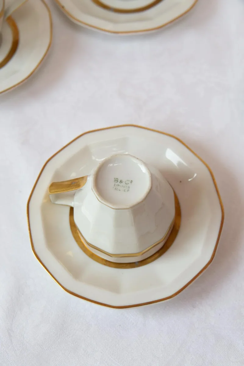 Antique French Limoges «Bernardaud» coffee set. c. 1920. 27 pieces for 12 people. No chips or cracks. Gold a bit faded in the saucers but great condition in general (see last photo) Dimensions: see description in Spanish. Shipping costs will be added at checkout.