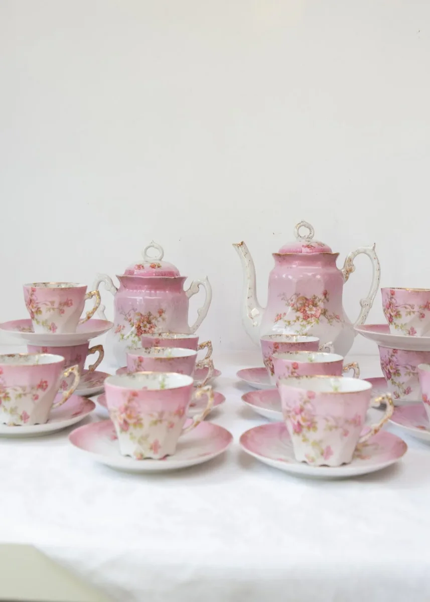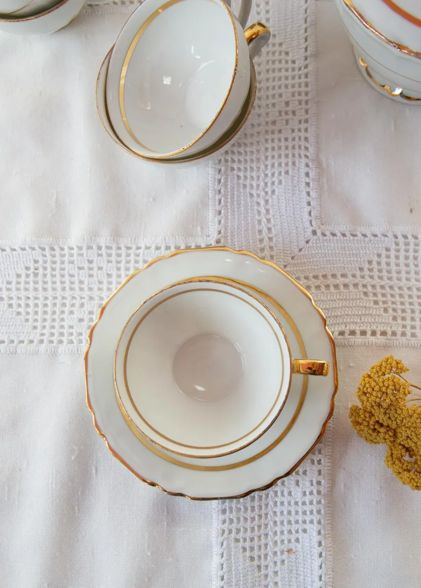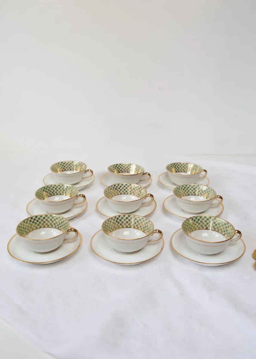 Antique French Limoges «Bernardaud» coffee set. c. 1920. 27 pieces for 12 people. No chips or cracks. Gold a bit faded in the saucers but great condition in general (see last photo) Dimensions: see description in Spanish. Shipping costs will be added at checkout.