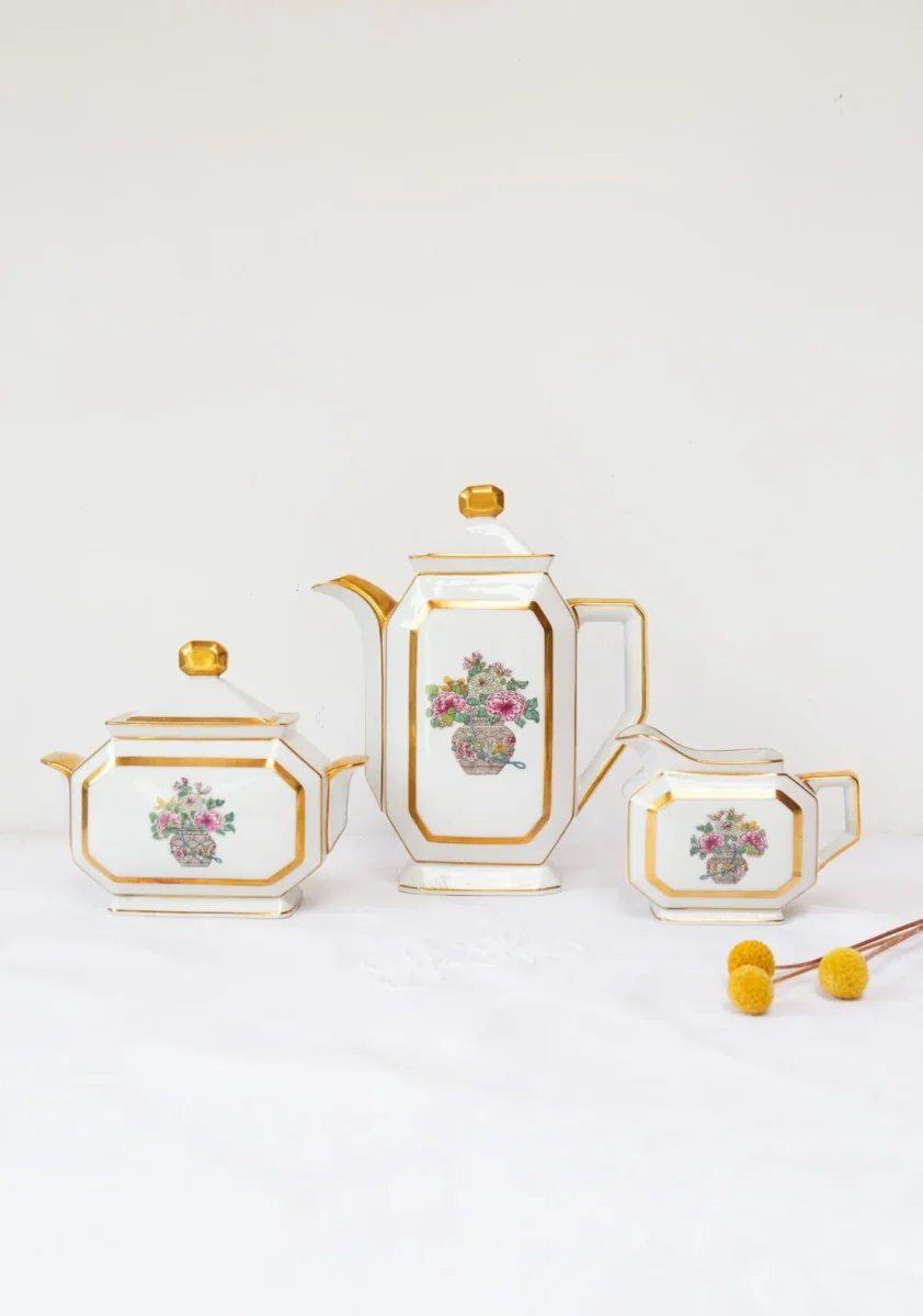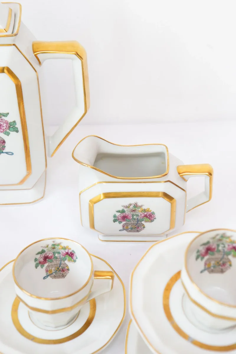 Antiguo juego de café francés de la más fina porcelana Limoges de la prestigiosa firma Bernardaud. Estilo y época art decó, aproximadamente años 1920.