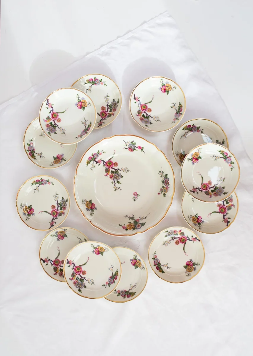 Juego de macedonia en porcelana francesa de la mayor calidad de la prestigiosa firma Bernardaud. Posiblemente sin estrenar ya que está como nuevo. El juego está formado por 1 fuente y 12 cuencos.