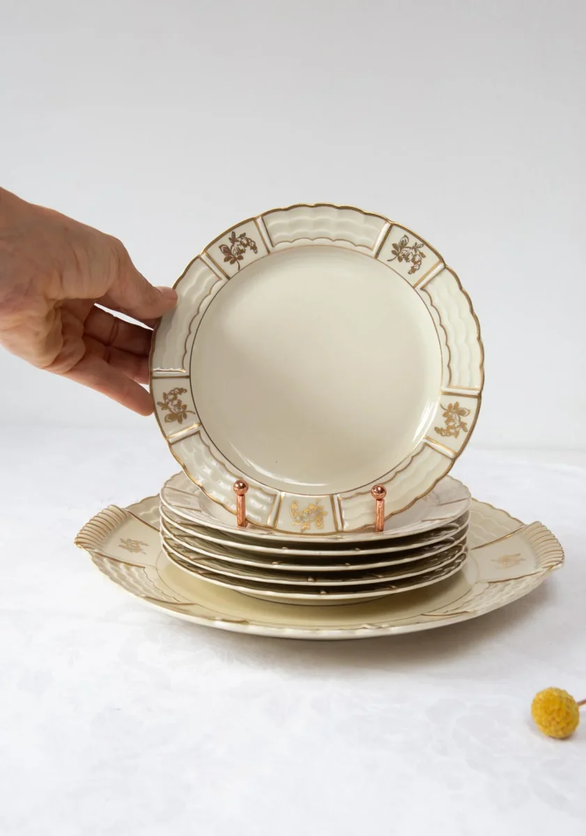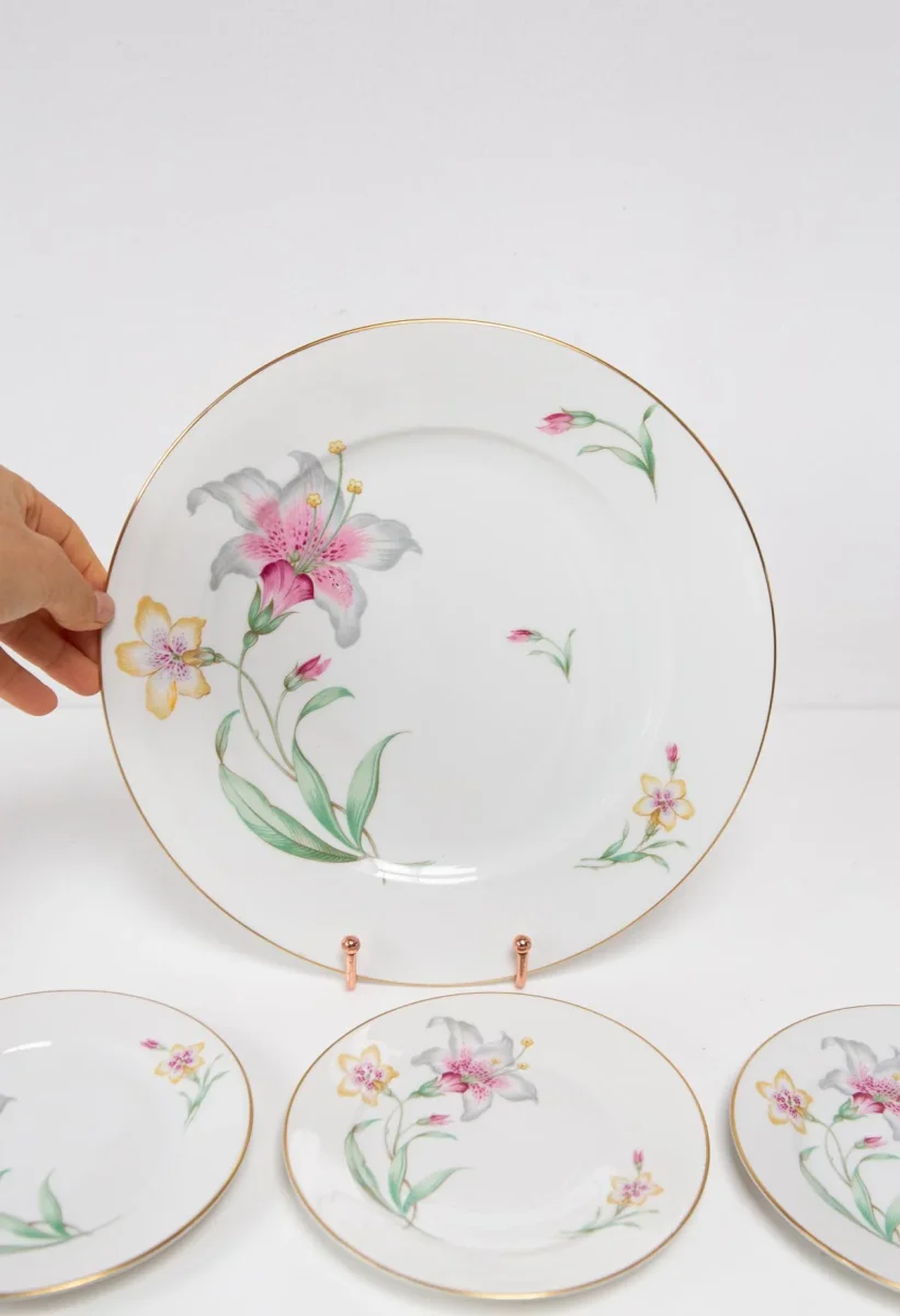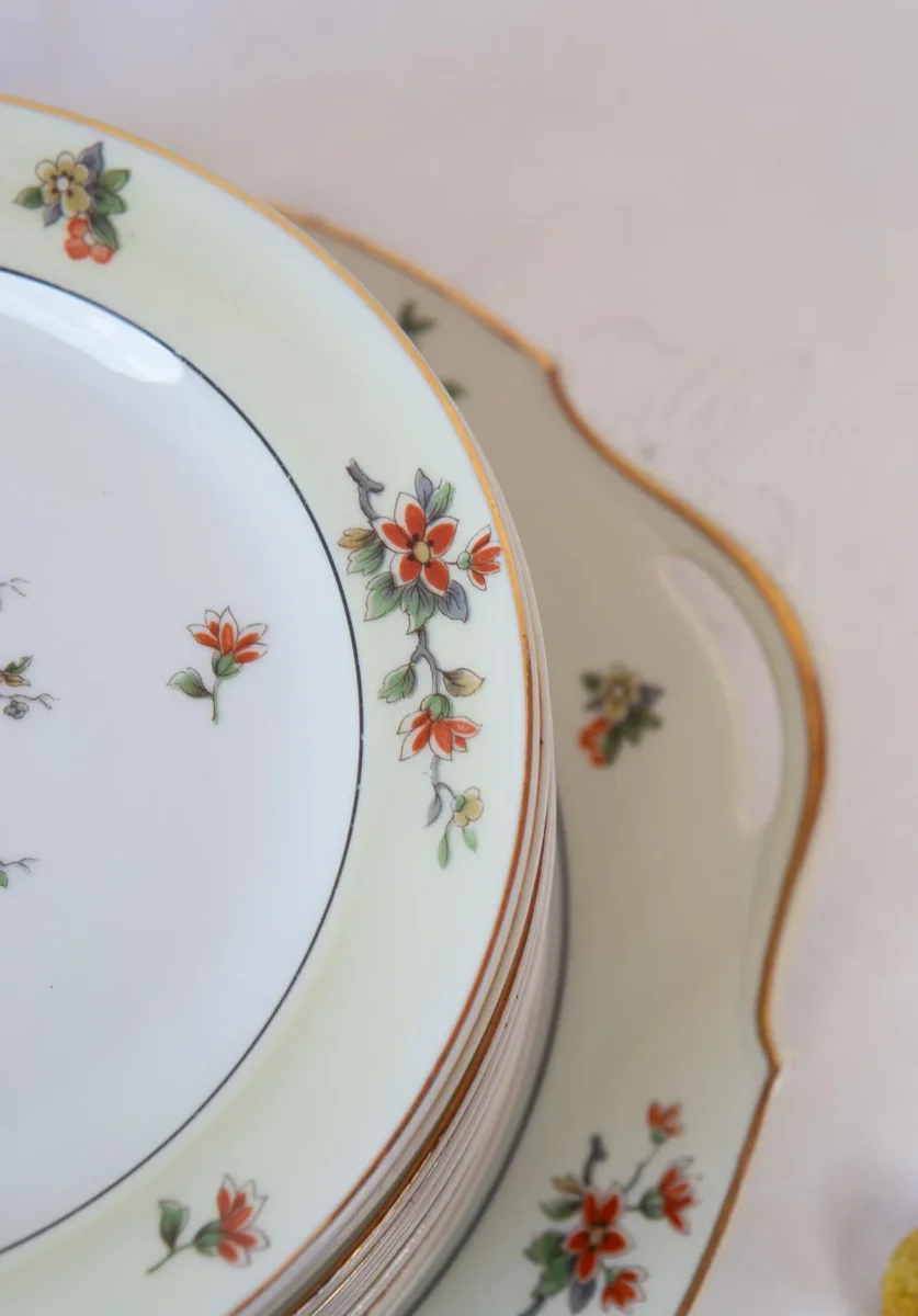 Service à dessert français en porcelaine Limoges «a. Lanternier». vers 1910. 12 pièces: 11 assiettes + 1 plat. Dimensions: ⌀ 19,5 cm (assiettes), 29*26,5 cm (plat). Pas d’éclats. Les frais d’expédition seront ajoutés dans le panier